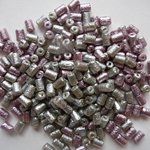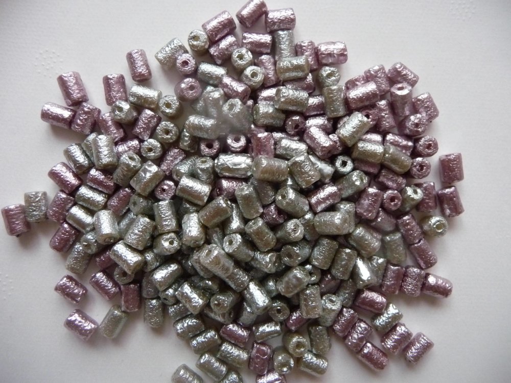 Ensemble de 250 perles synthétiques (100 couleur rose,150 couleur gris perle), forme cylindrique, aspect martelé et irisé.