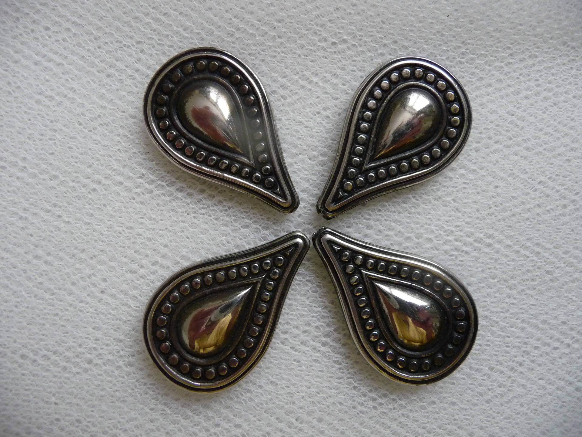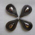 Voici 4 grosses perles fantaisie, plates, forme goutte, en plastique aspect métal argenté vieilli.