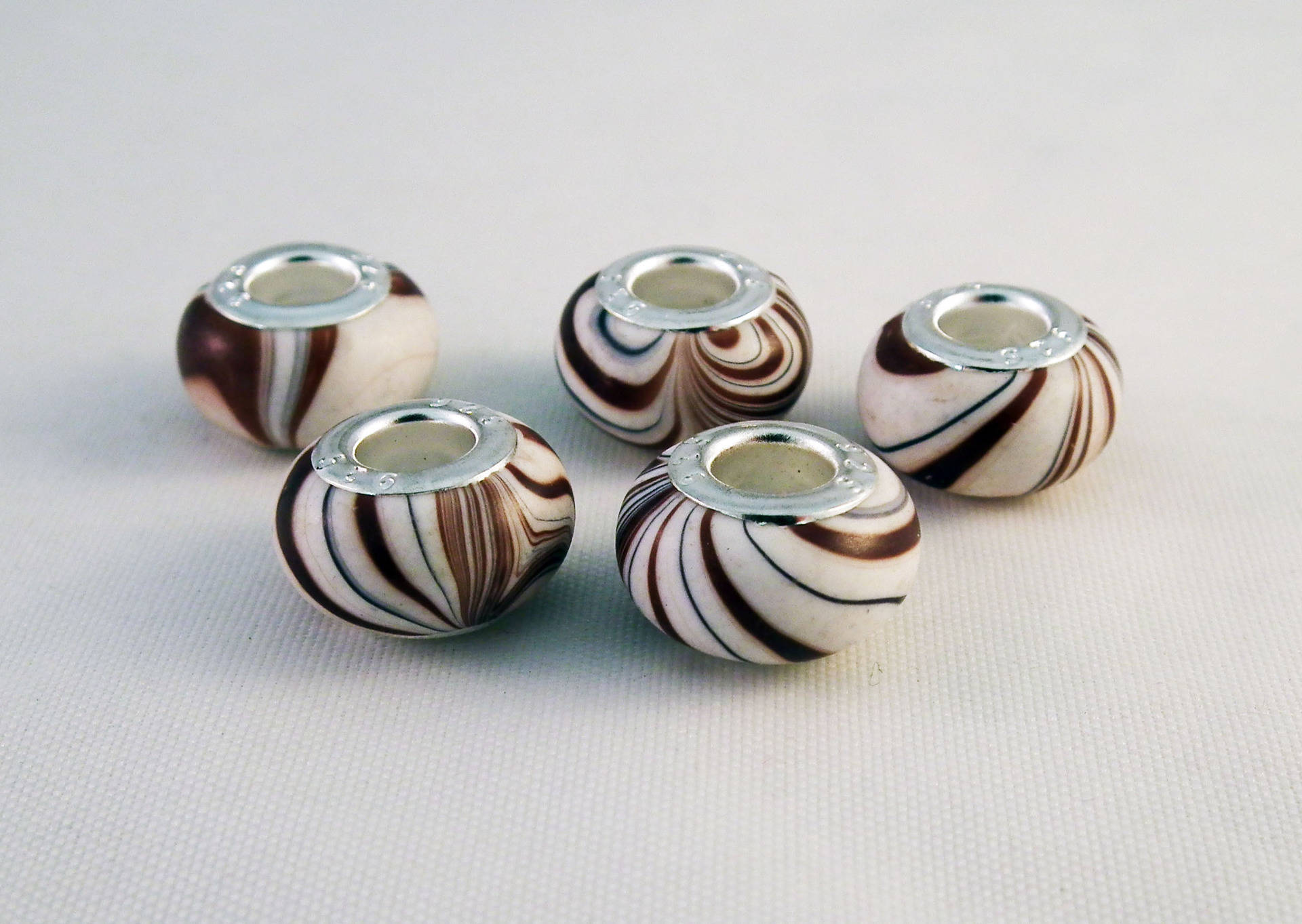 Lot de 5 Perles à motifs Teintes de Marron et Blanc de style Pandora de 14mm X 8mm, Taille de trou 5mm.