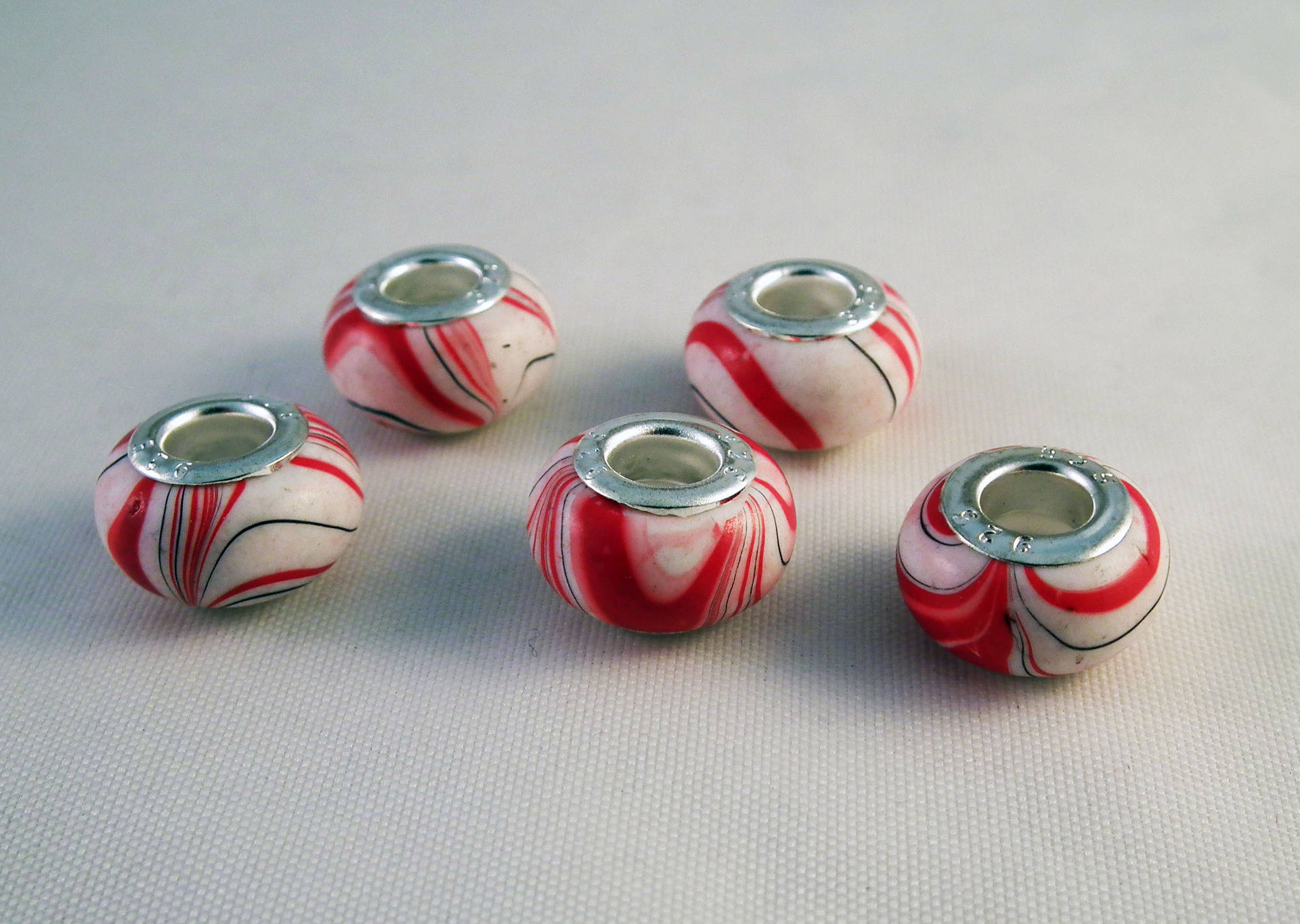 Lot de 5 Perles à motifs Teintes de Rouge et Blanc de style Pandora de 14mm X 8mm, Taille de trou 5mm.