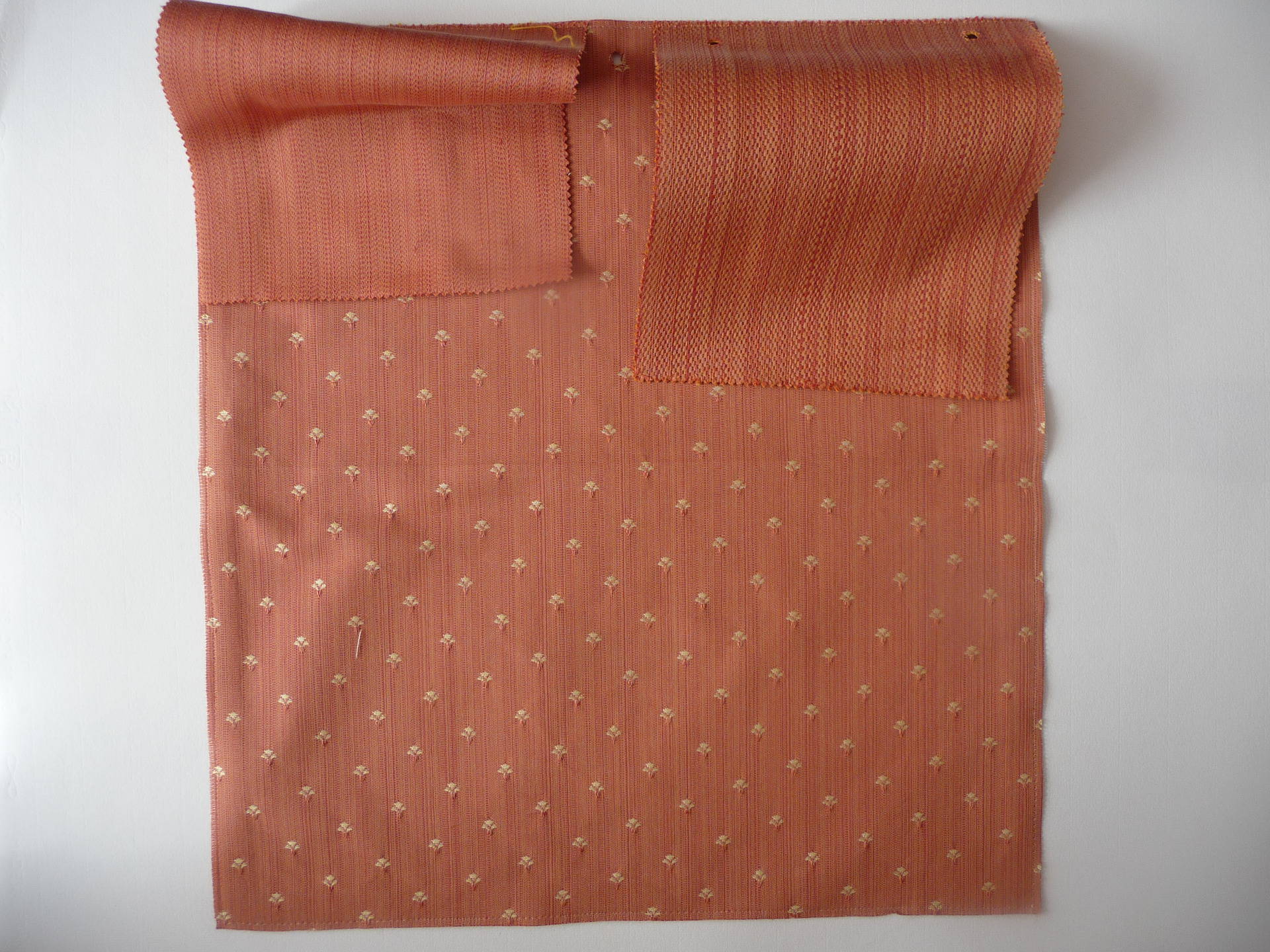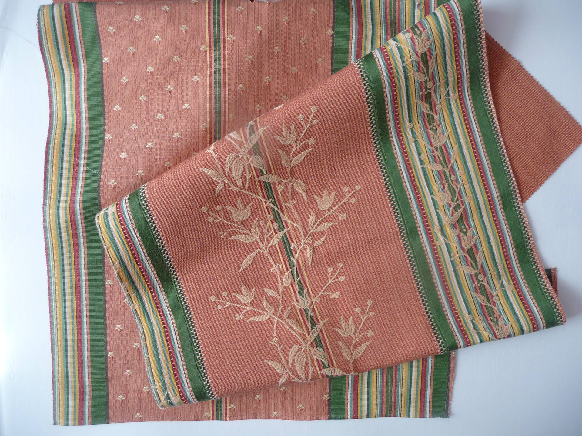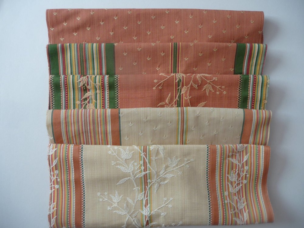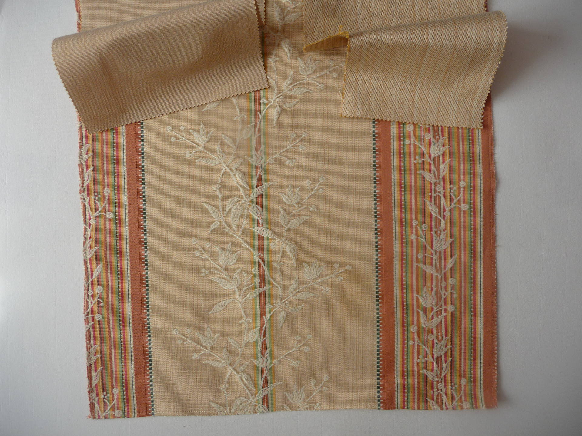 Je vous propose ces 5 panneaux de tissu d'ameublement dans les coloris jaune pâle, brique et vert, en viscose (36 %) et coton (64 %).