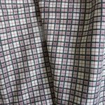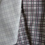 Belle qualité de tissu pour ce coupon de 70 cm x 70 cm, fond beige avec carreaux kaki et grenat sur une face, l'autre face étant beige sans motifs..