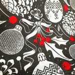Polycoton épais, fond gris foncé, boules, pommes de pin et rubans blanc-grisé, baies rouges, vente par 50 cm/135 cm