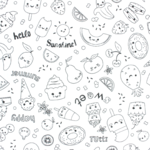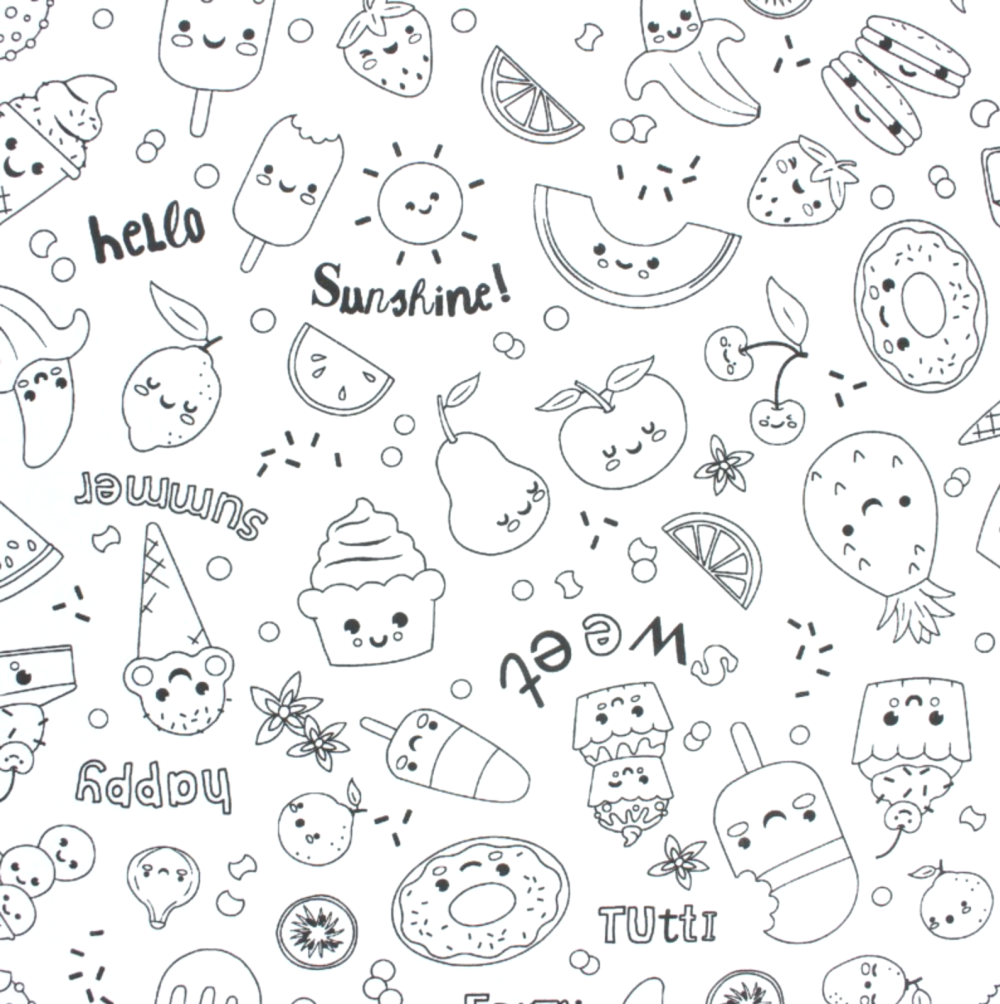 Tissu 100% coton blanc à colorier sur le thème de la gourmandise avec des gâteaux, des glaces, des fruits....