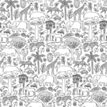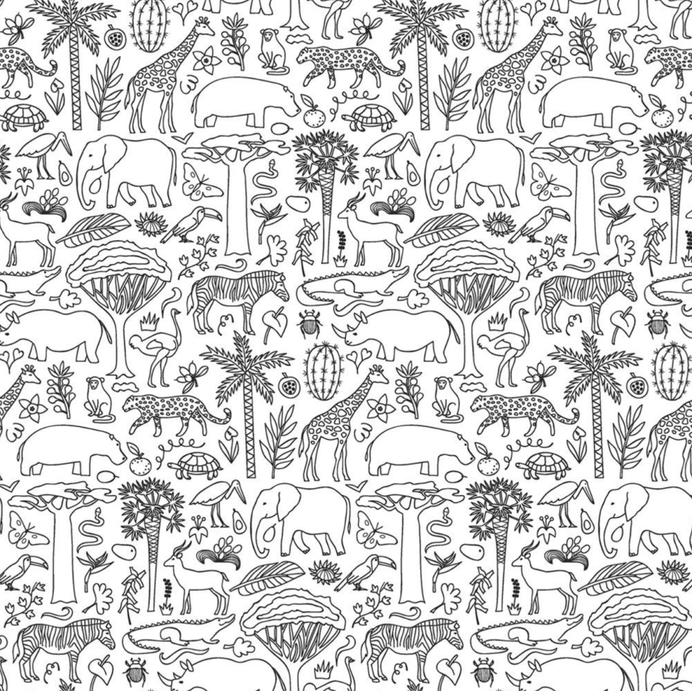 Tissu 100% coton blanc à colorier sur le thème des animaux de la savane, le tissu peut être colorier avec des feutres standards et tout partira au lavage.