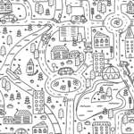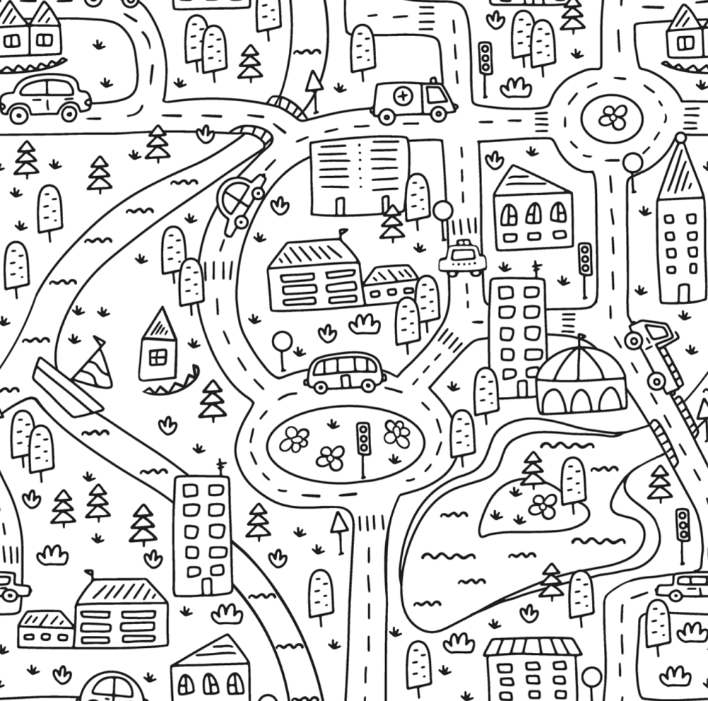 Tissu 100% coton blanc à colorier imprimé villes avec des routes, des voitures, des maisons. Le tissu est lavable bien sur pour enlever le crayon