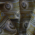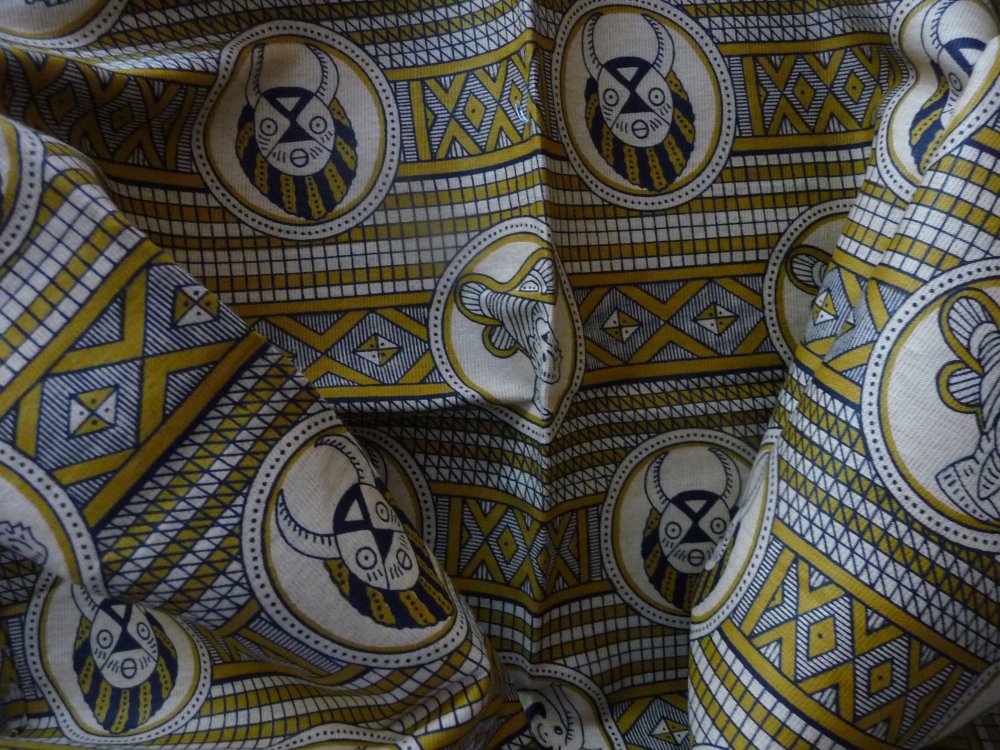 Voici un joli coupon de tissu africain, fond ocre et marron clair avec motifs ethniques géométriques et médaillons masques, profils féminins, éléphants.