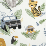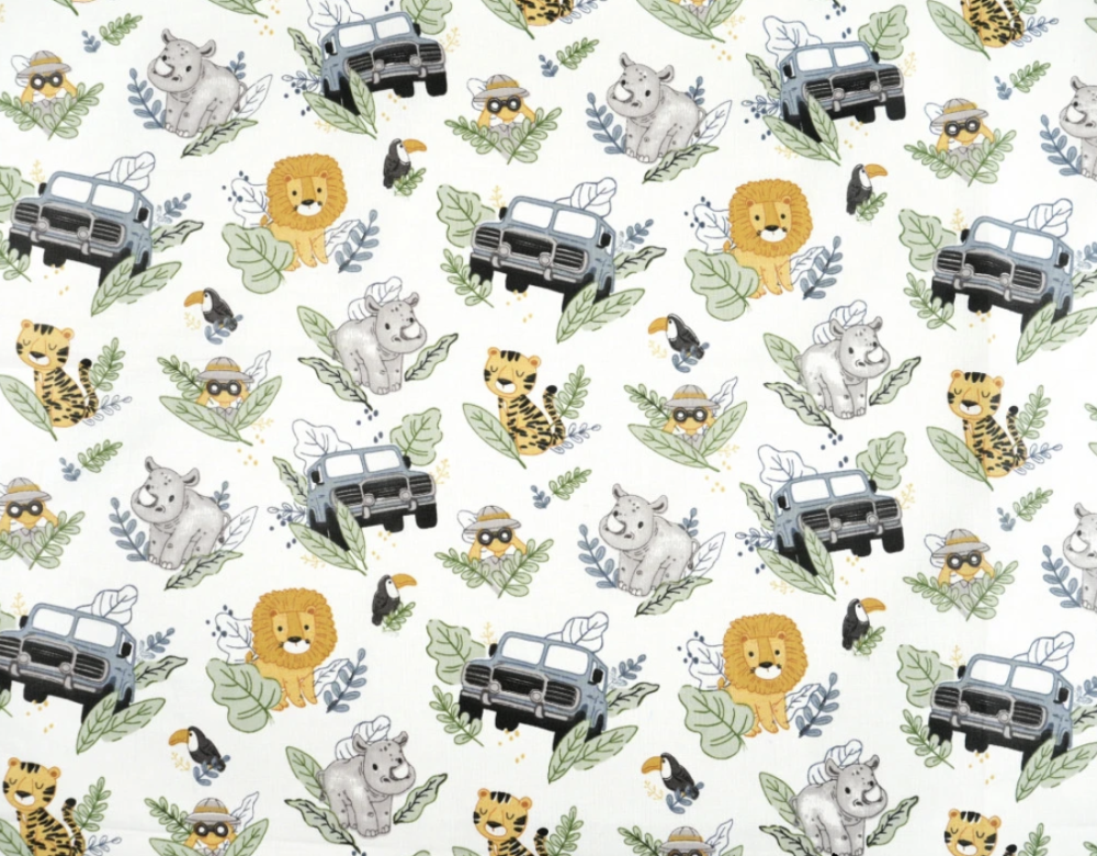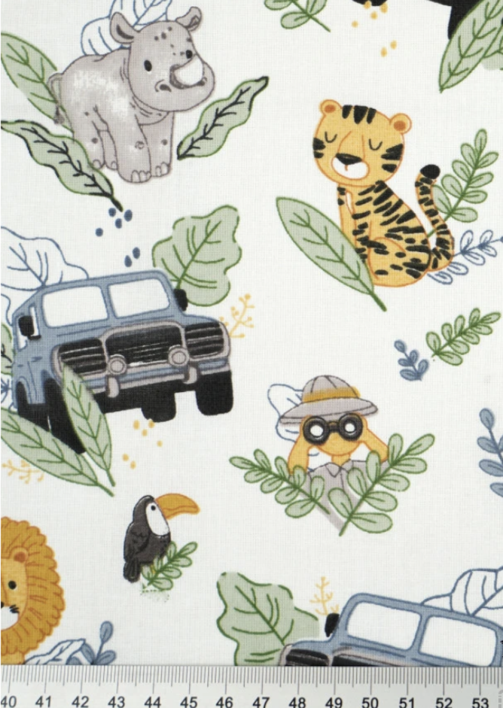 Tissu 100% coton blanc avec des animaux de la savane dessus, des lions, des rhinocéros, des tigres..