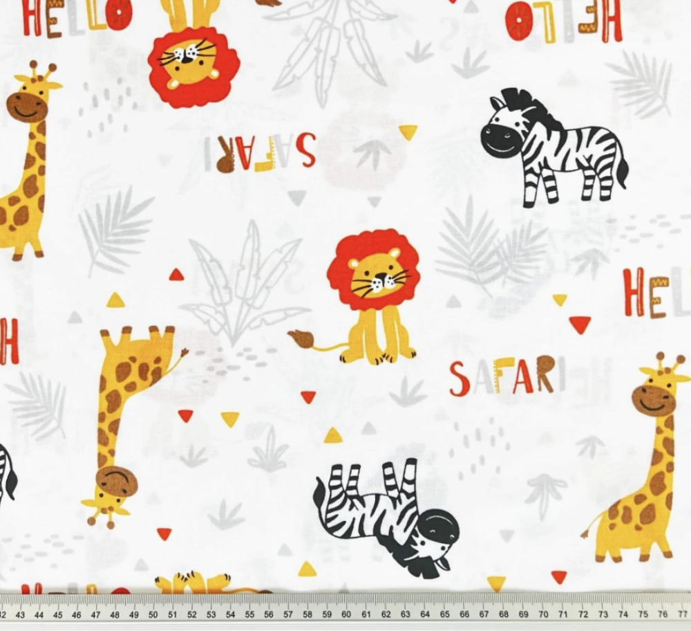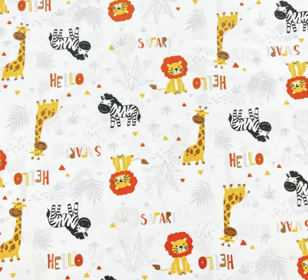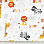 Tissu 100% coton blanc avec des animaux de la savane dessus, des lions, des girafes...