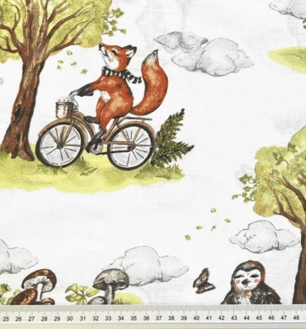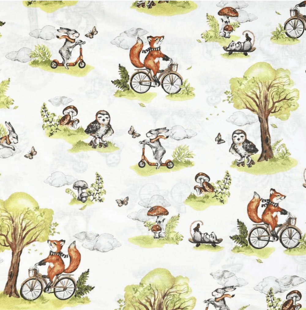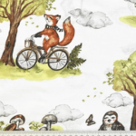 Tissu 100% coton blanc avec des animaux qui font du vélo.