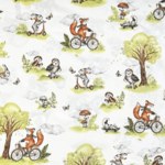 Tissu 100% coton blanc avec des animaux qui font du vélo.