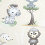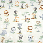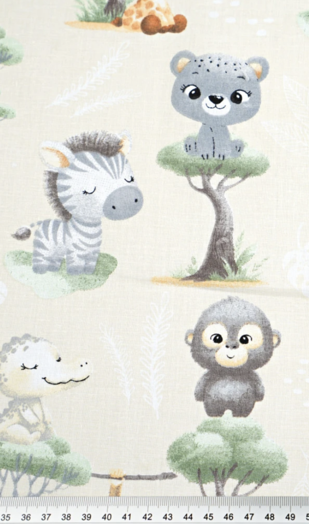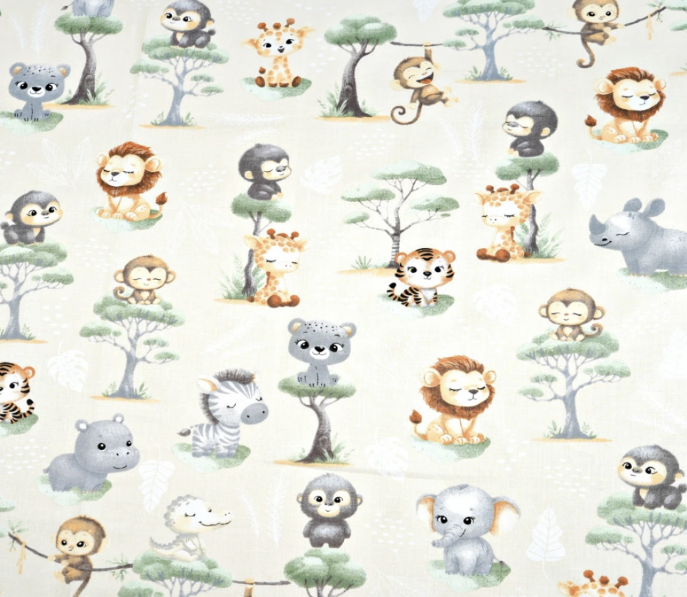 Tissu 100% coton jaune paille avec des bébé animaux de la savane dessus, des lions, des girafes...
