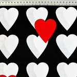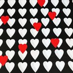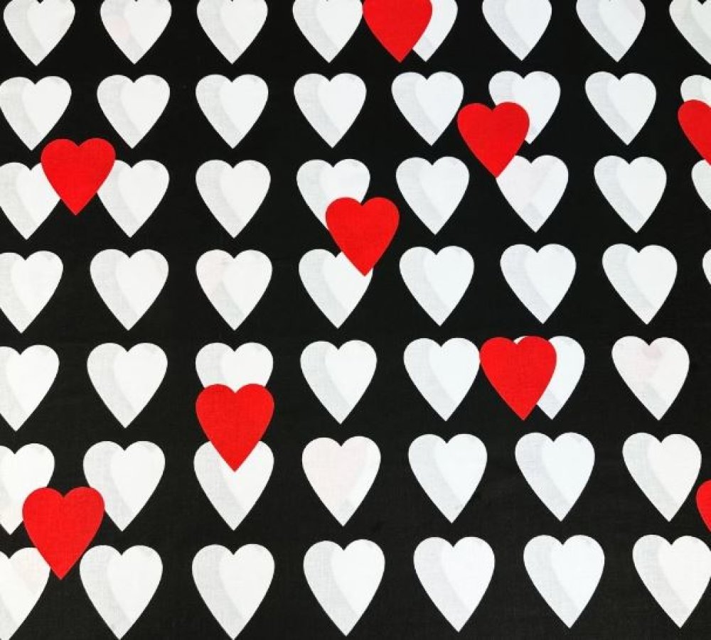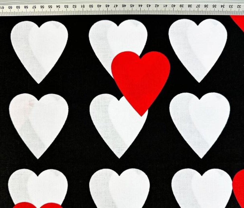 Tissu 100% coton noir avec des coeurs de 8 cm de haut rouge et blanc