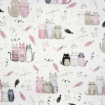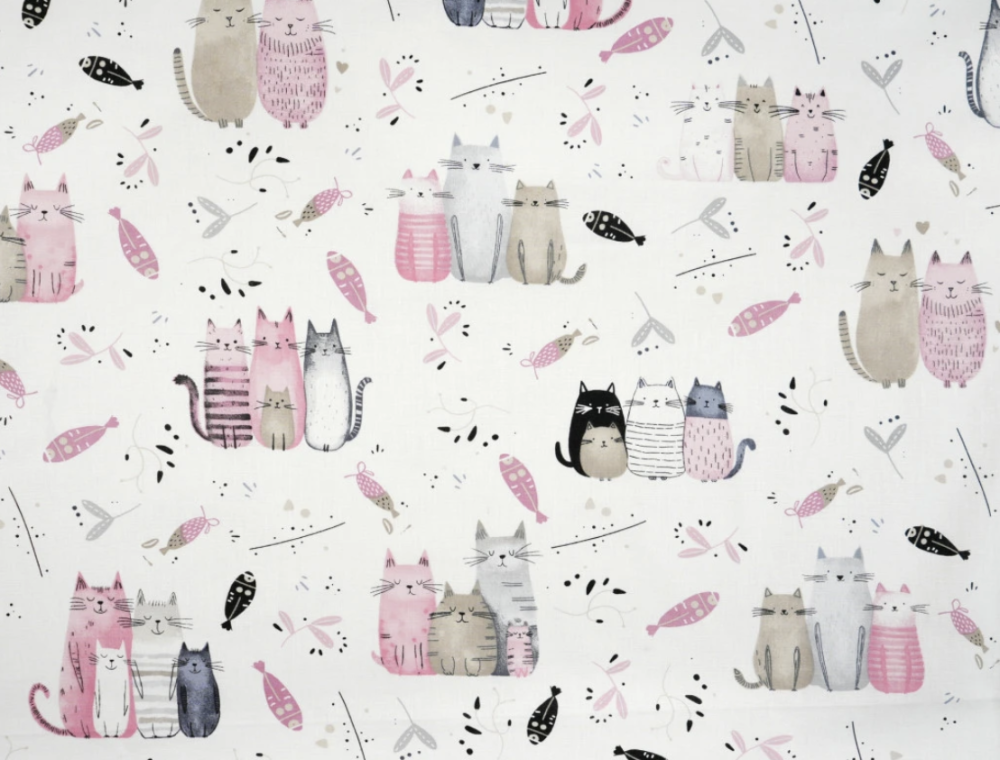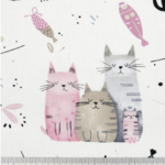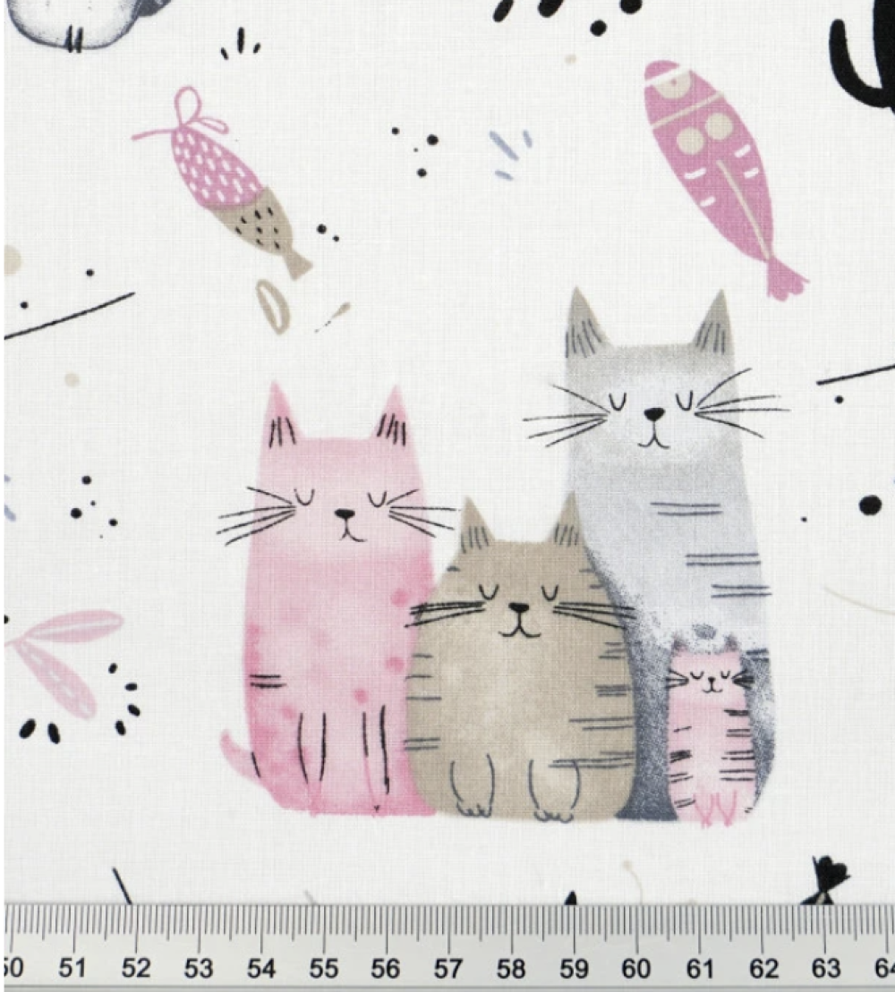 Tissu 100% coton fond blanc imprimé avec des chats roses et gris