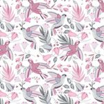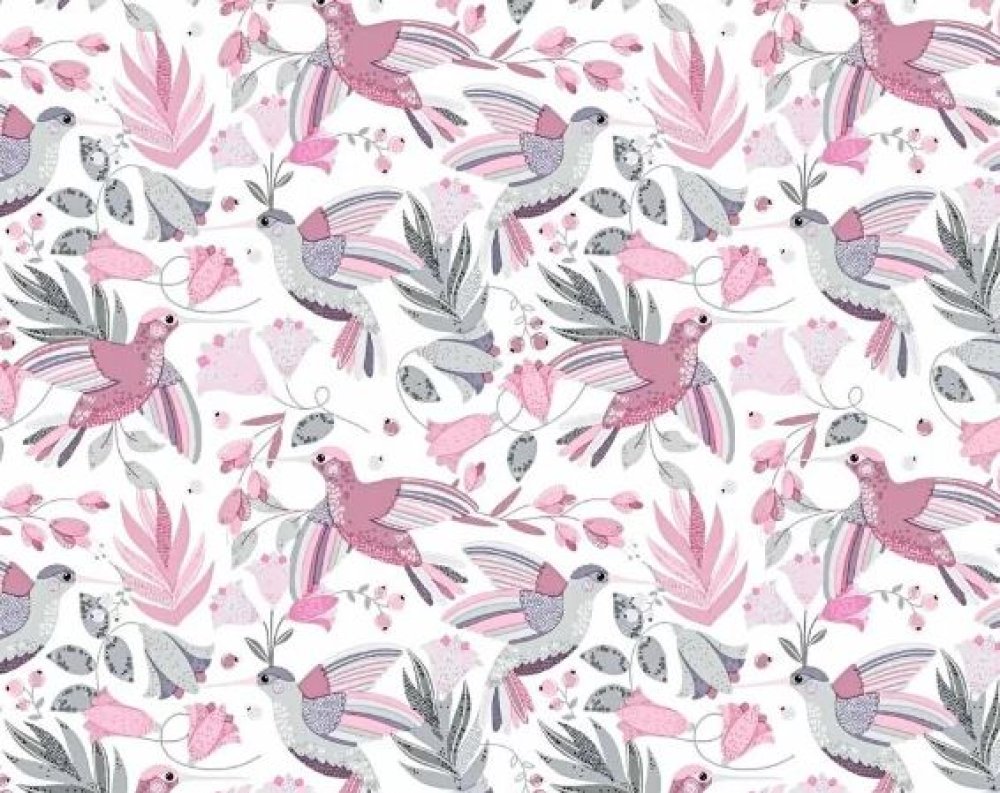 Tissu 100% coton blanc avec des colibris gris et roses dessus