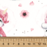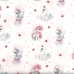 Tissu 100% coton blanc avec des licornes, cygnes et fées gris et rose