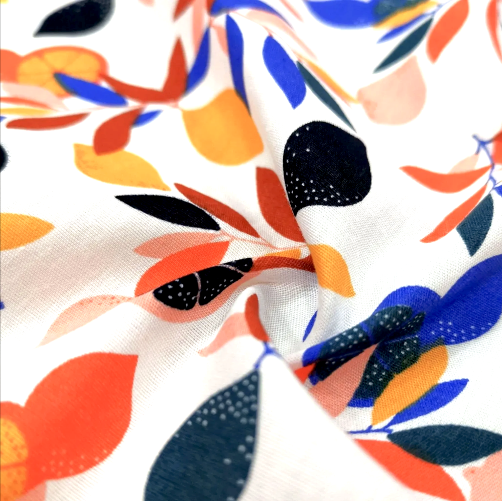 Tissu 100% coton blanc avec des feuilles et des fruits multicolores dessus