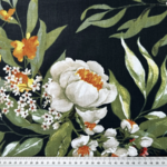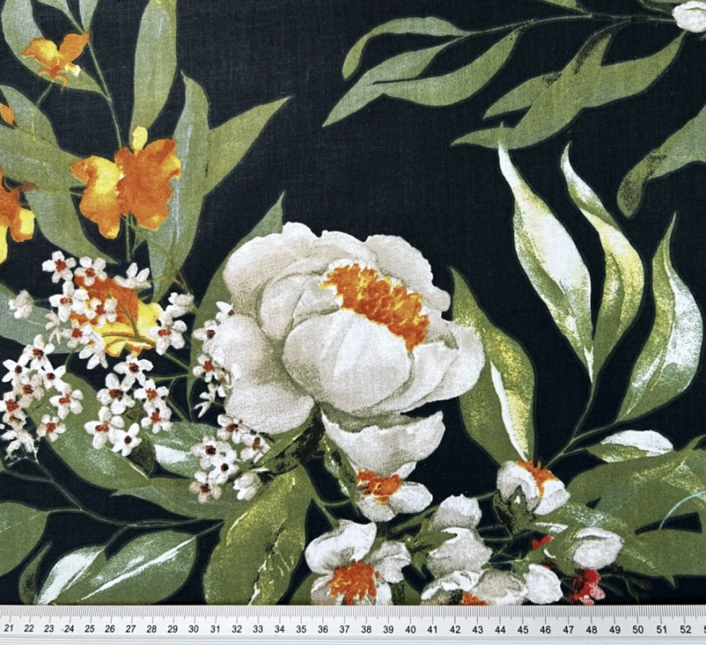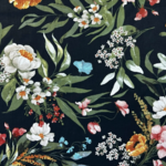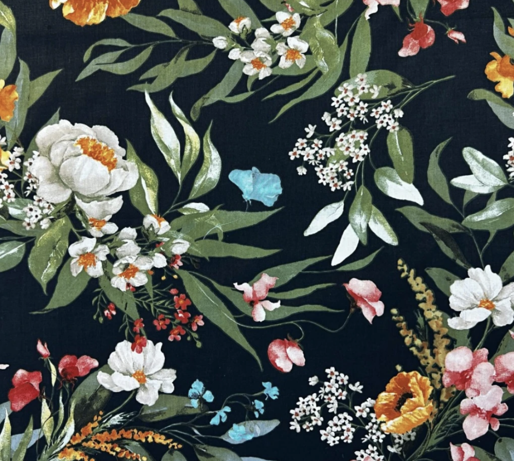Tissu 100% coton bleu marine imprimé de grandes fleurs multicolores