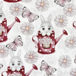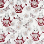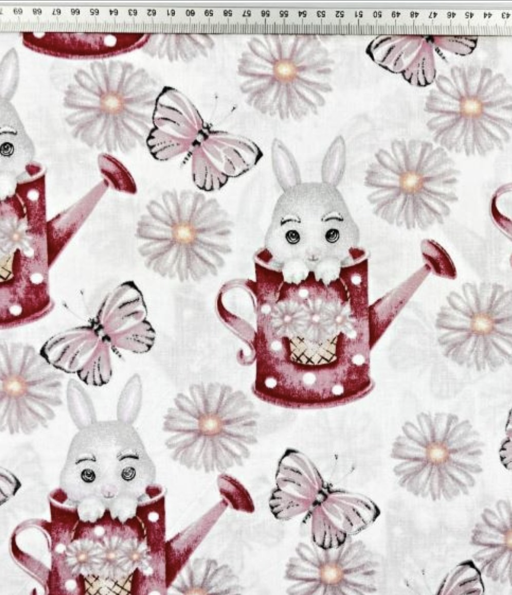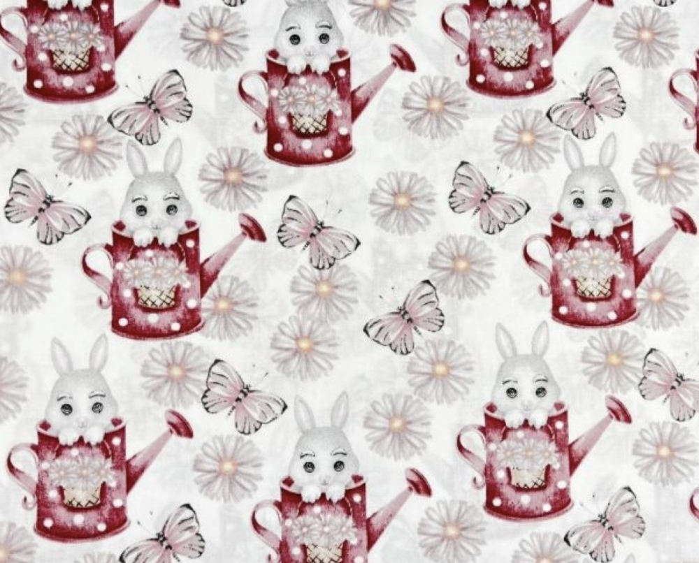 Tissu 100% coton blanc imprimé de lapins dans un arrosoir