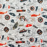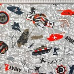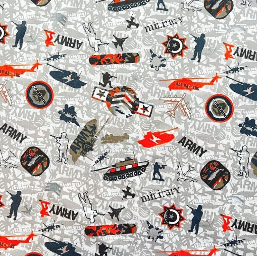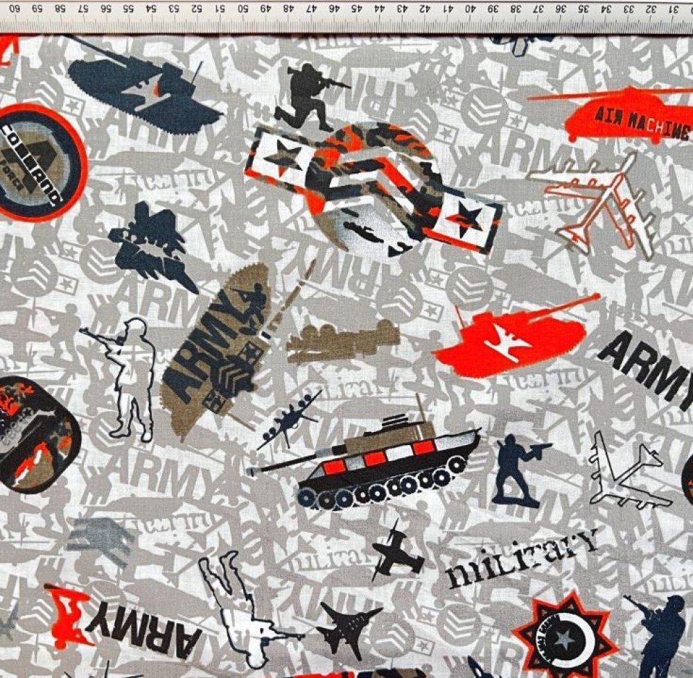 Tissu 100% coton militaire beige et gris imprimé sur le thème de l'armée.