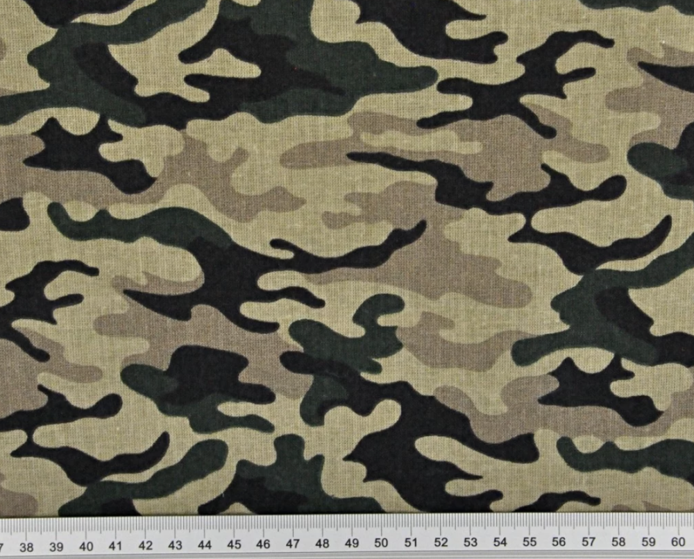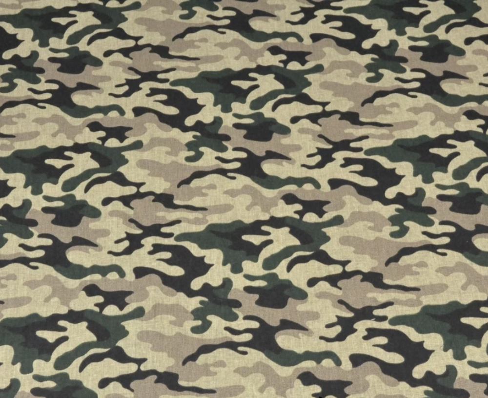 Tissu 100% coton militaire imprimé camouflage beige, kaki et noir