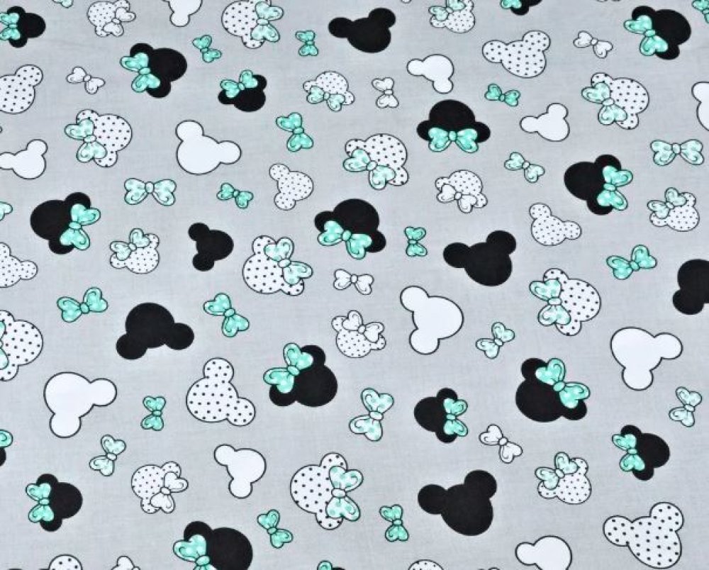 Coupon tissu 100% coton gris avec la tête de Minnie et un nœud vert menthe