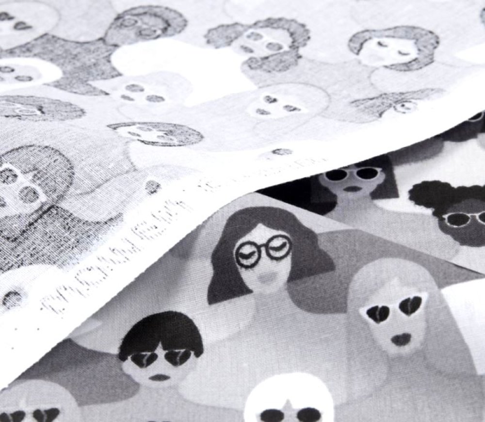Tissu 100% coton gris, noir et blanc imprimé de personnages