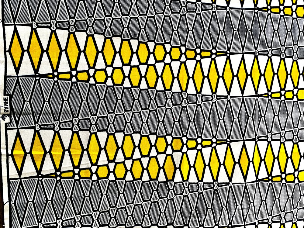 Tissu 100% coton wax donc légèrement ciré avec des imprimés blanc, jaune et marine pour un esprit africain très tendance