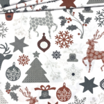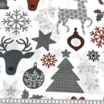 Tissu 100% coton blanc avec des décorations grise et rouge sur le thème de Noël