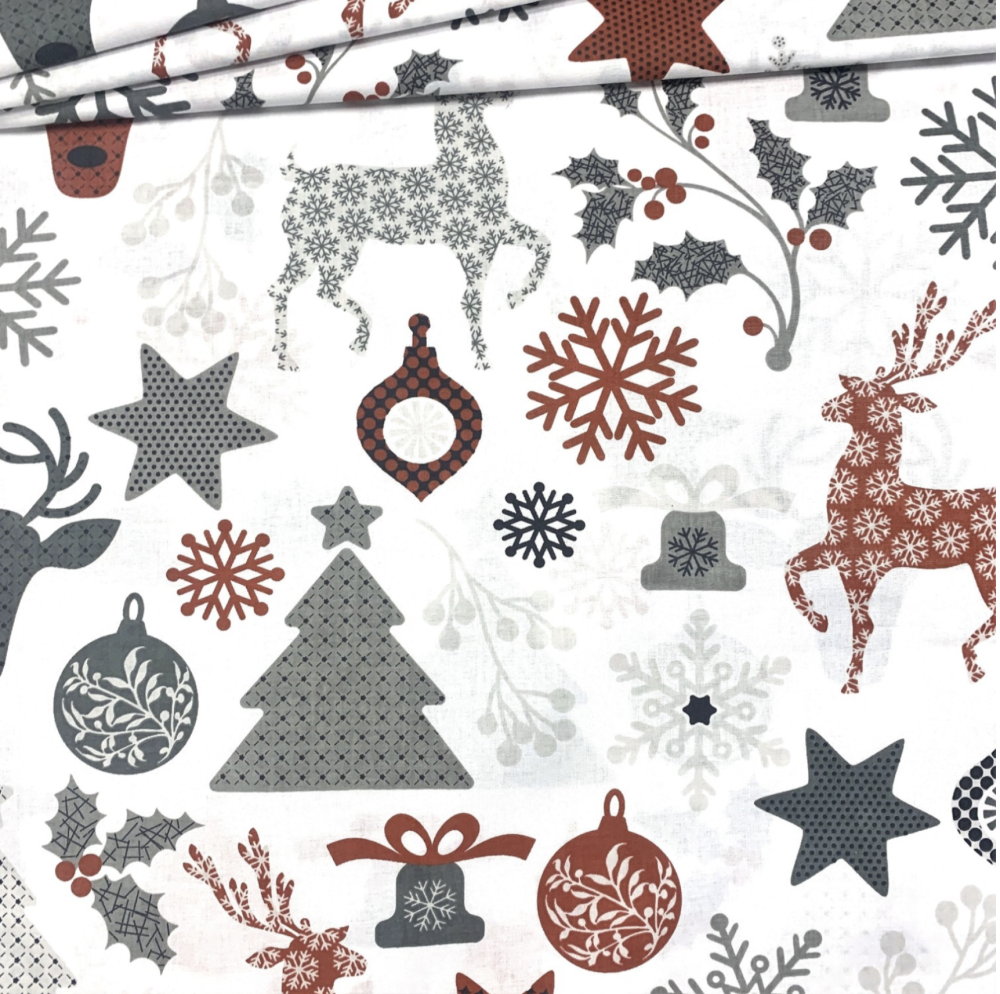 Tissu 100% coton blanc avec des décorations grise et rouge sur le thème de Noël