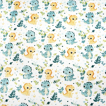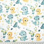 Tissu 100% coton blanc avec des dinosaures bleu pétrole et jaunes