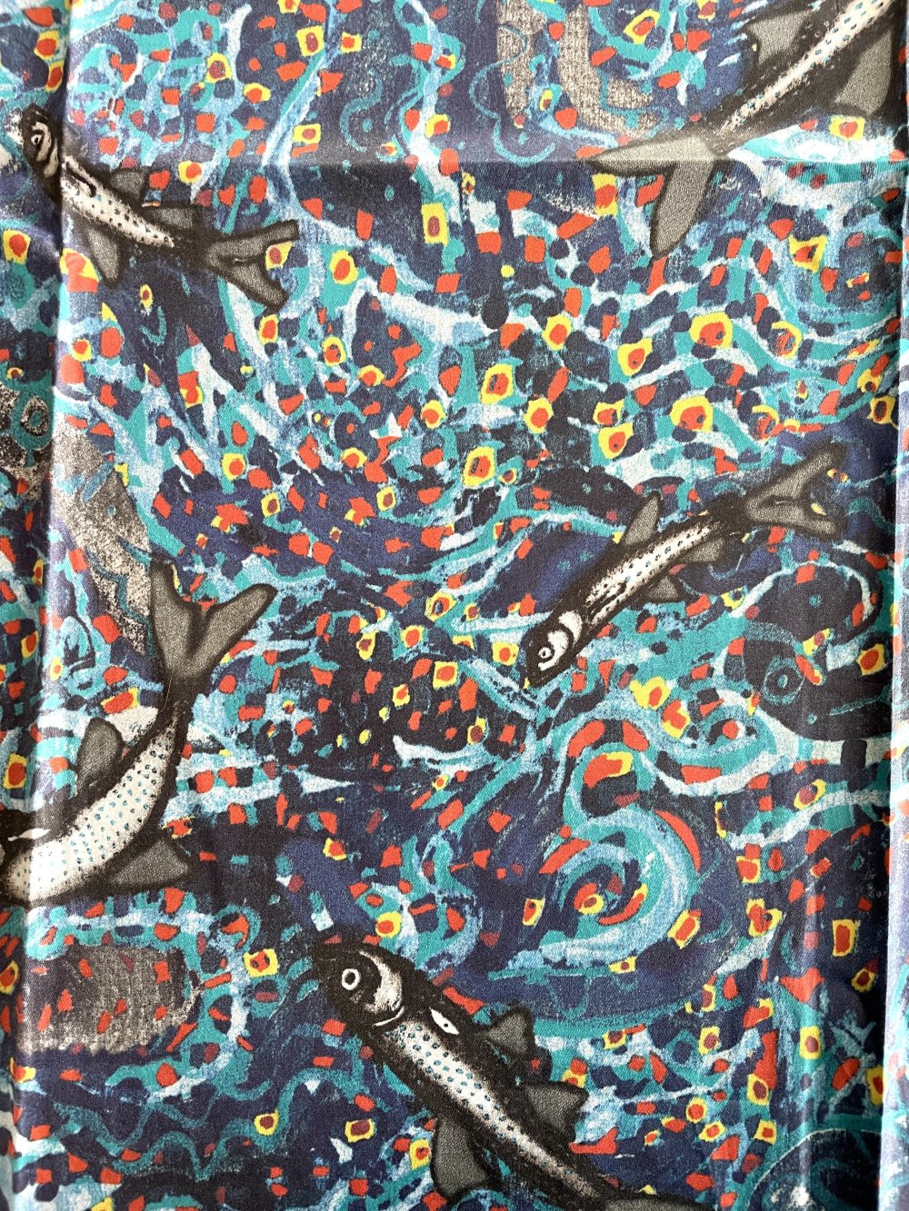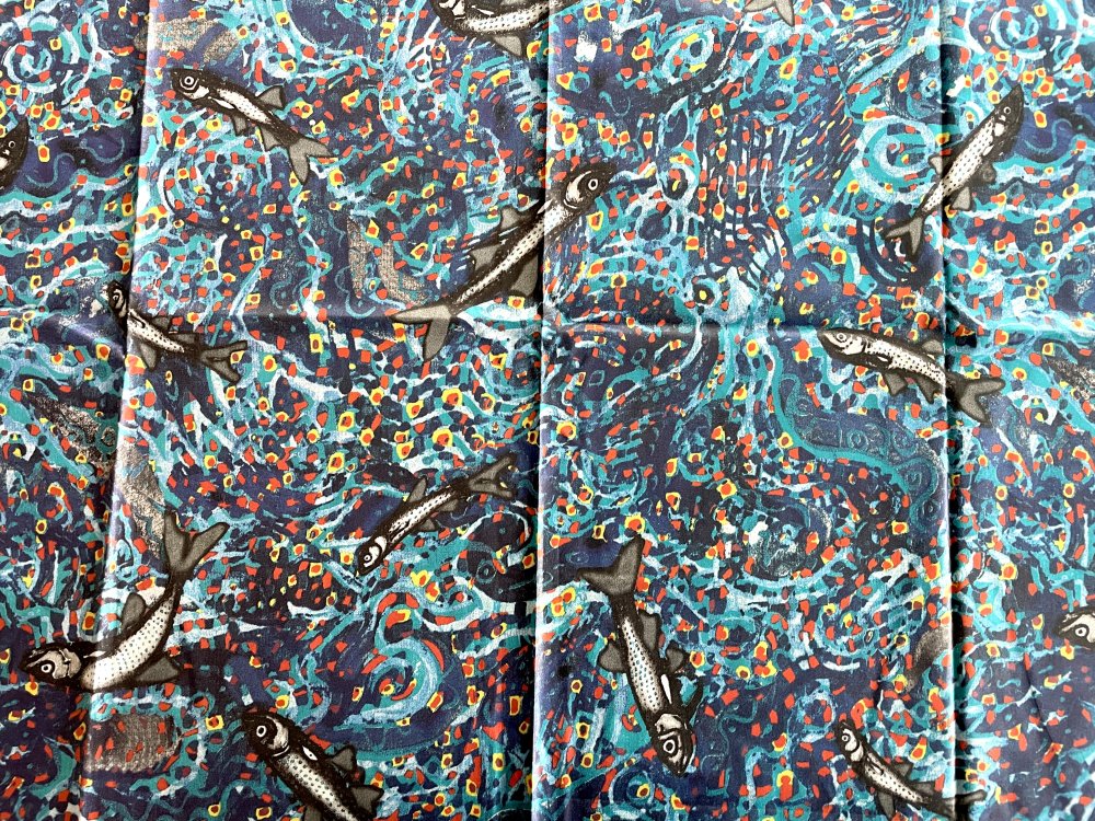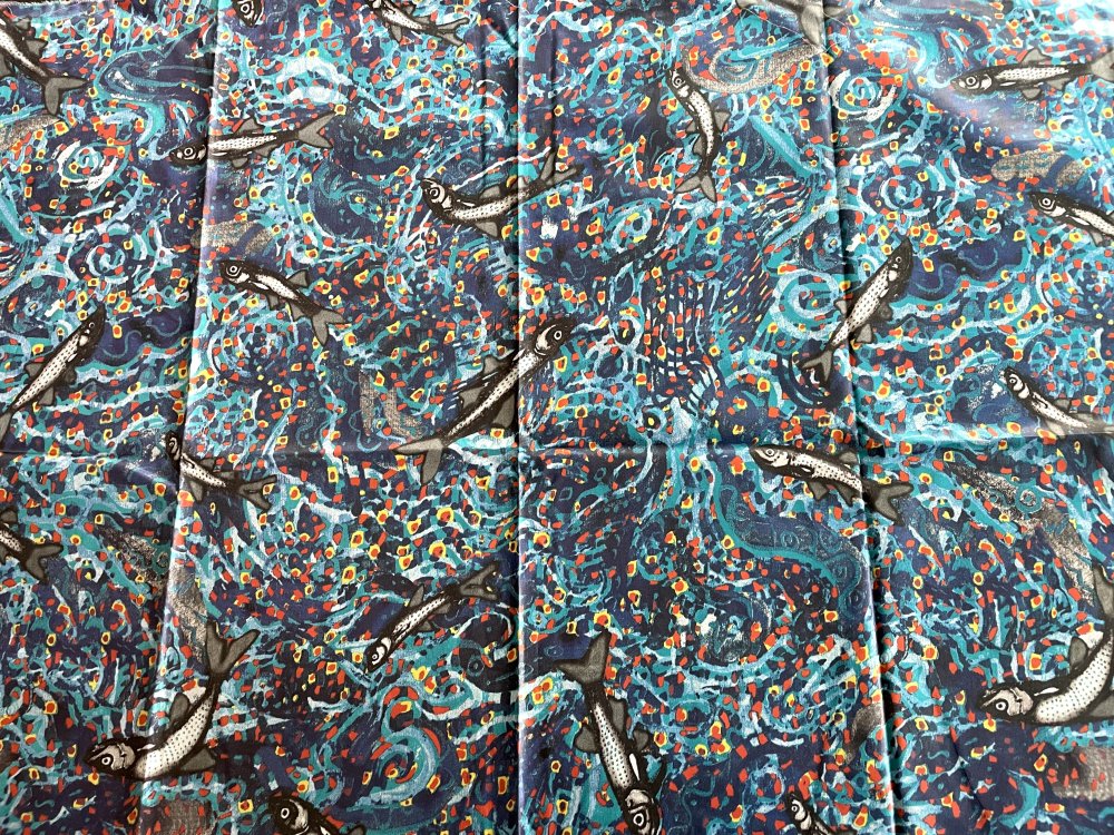 Tissu 100% coton enduit multicolore avec des sardines dessus.