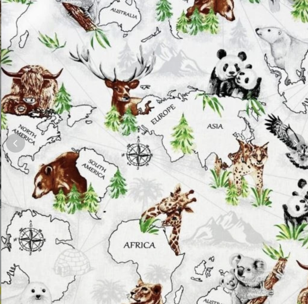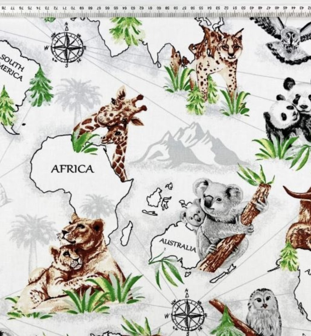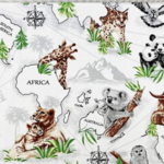 Tissu 100% coton blanc imprimé d'animaux sur un atlas: ours, panda, phoques, cerf, girafes...