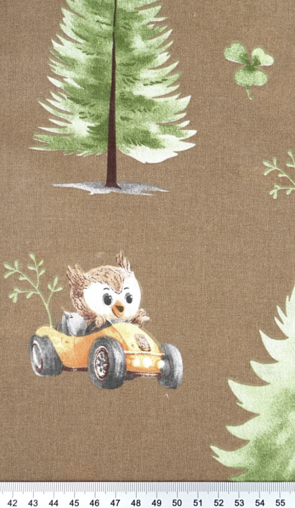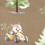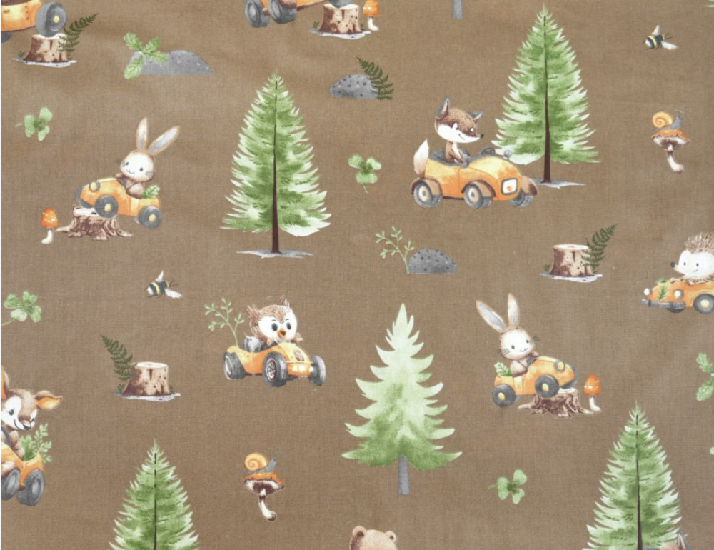 Tissu 100% coton enfant marron avec des petits animaux en voiture dans la forêt
