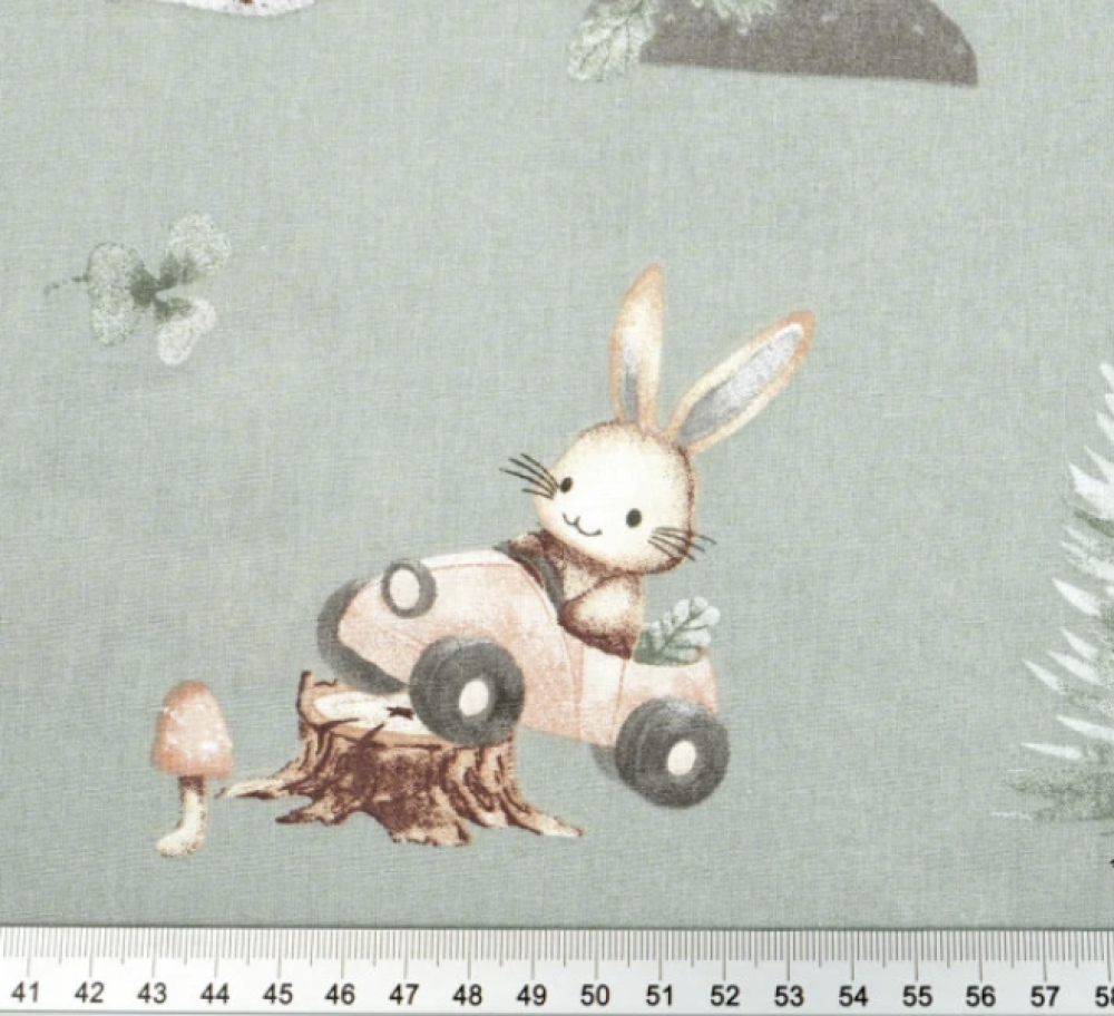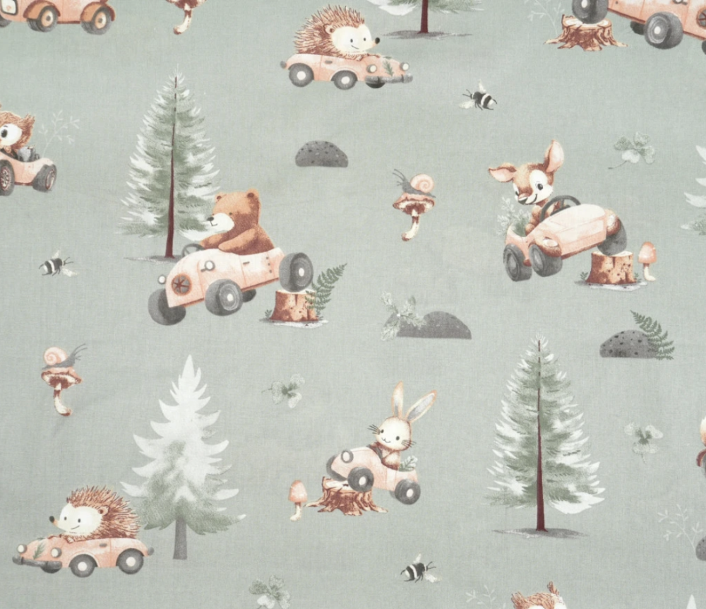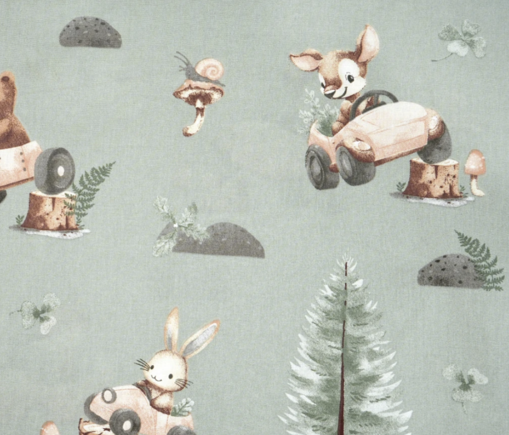 Tissu 100% coton enfant vert sauge avec des petits animaux en voiture dans la forêt