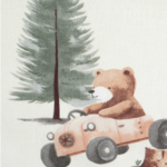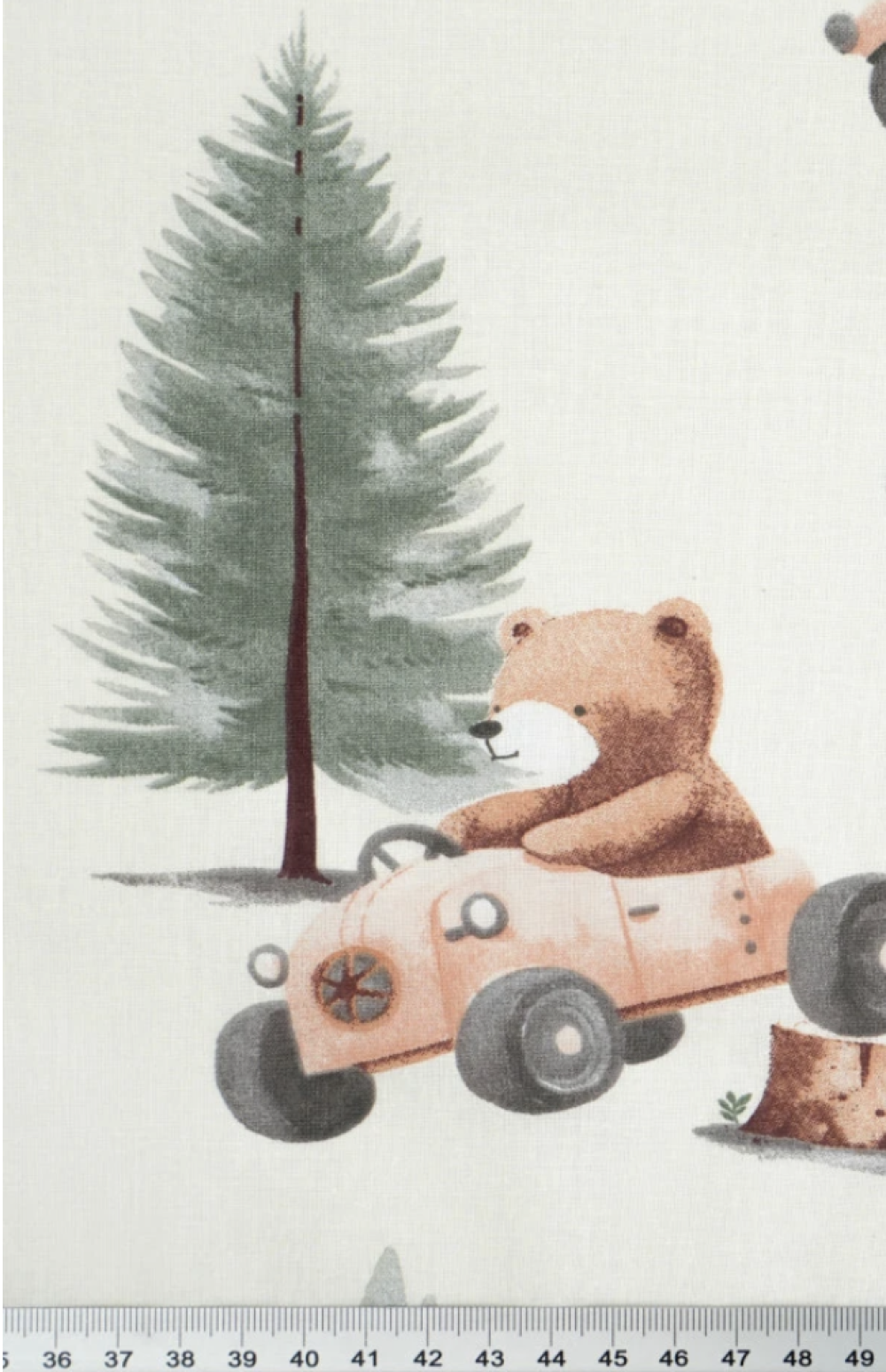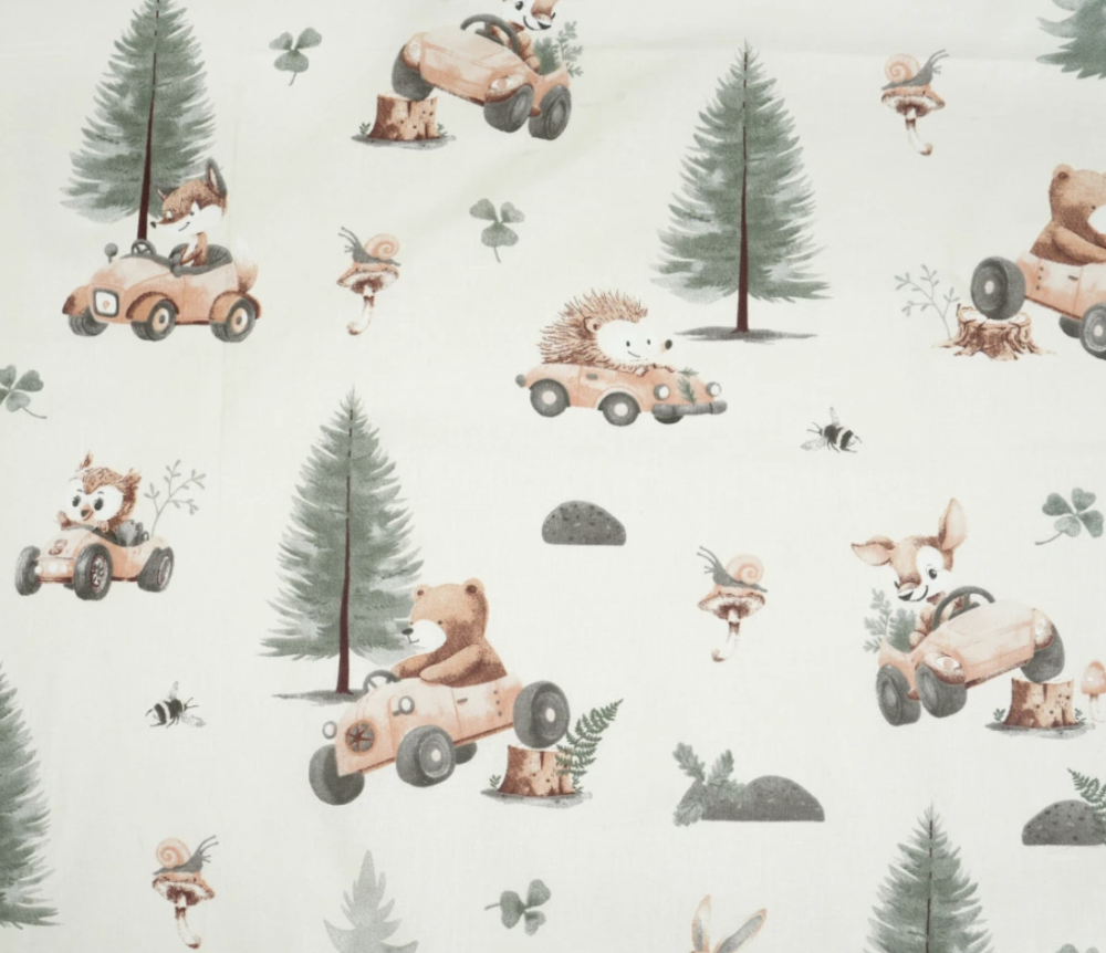 Tissu 100% coton enfant beige avec des petits animaux en voiture dans la forêt