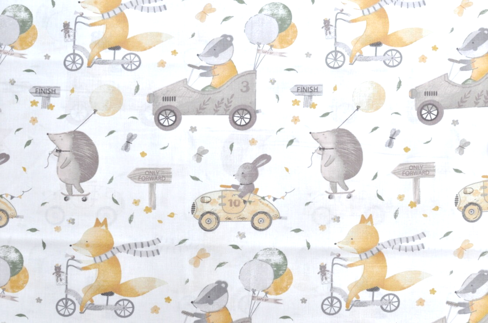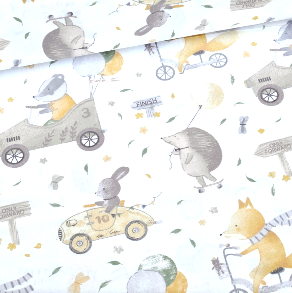 Tissu 100% coton enfant blanc avec des petits animaux qui font la course