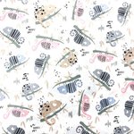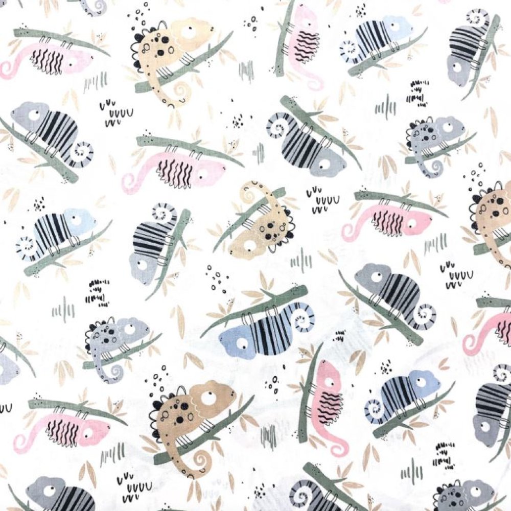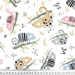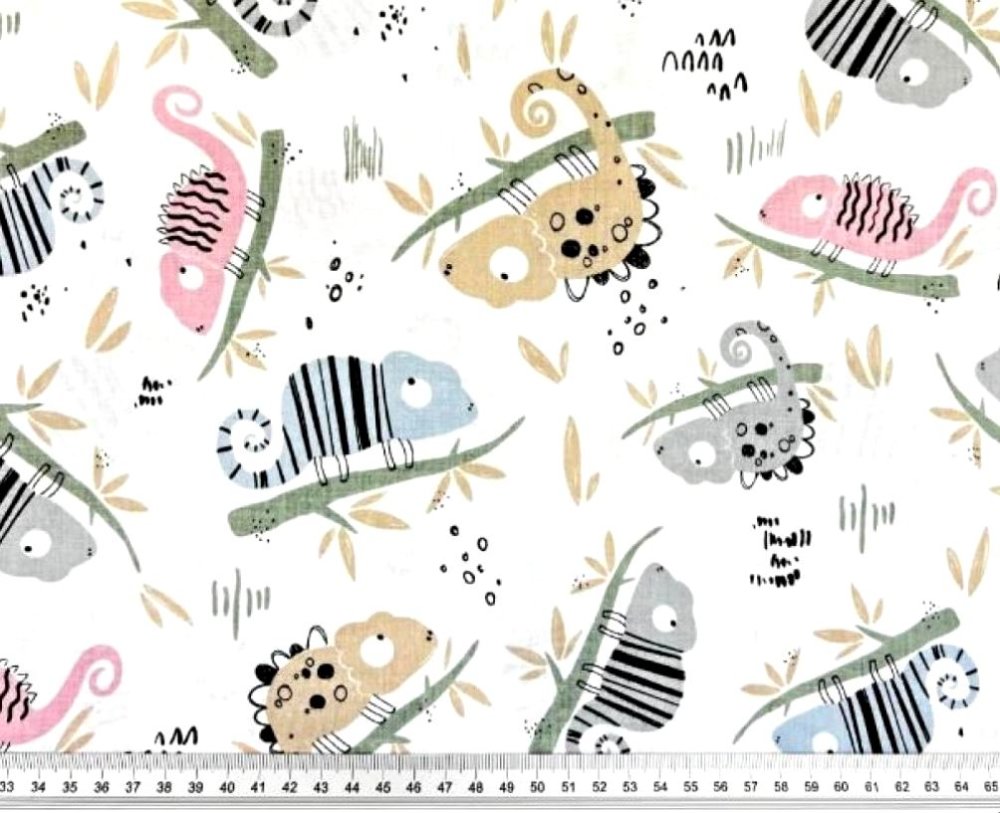 Tissu 100% coton blanc avec des petits caméléons rose, beige ou gris