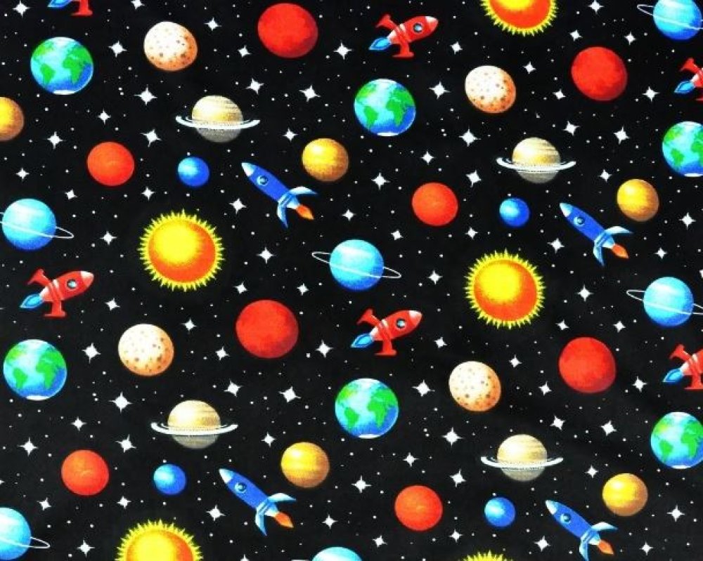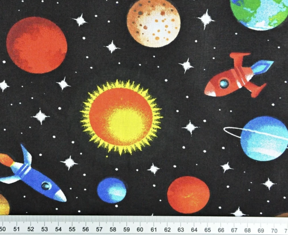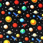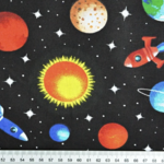 Tissu 100% coton enfant noir avec des petites planètes, des fusées et des étoiles multicolores