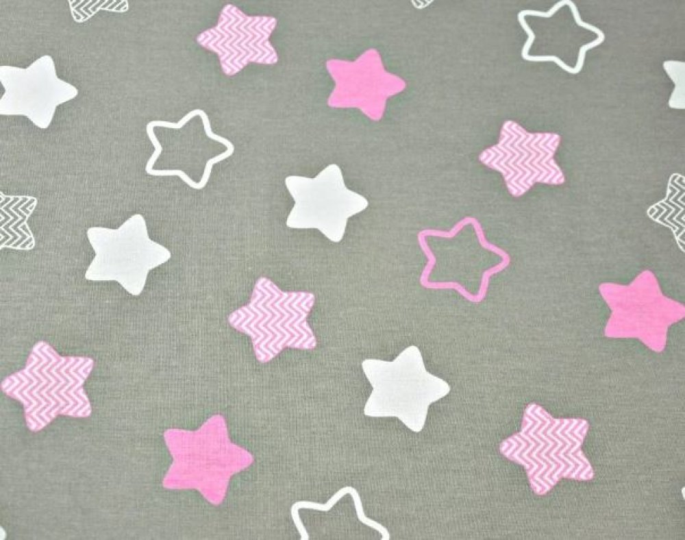Coupon de tissu 100% coton gris avec des étoiles, roses et blanches dessus.