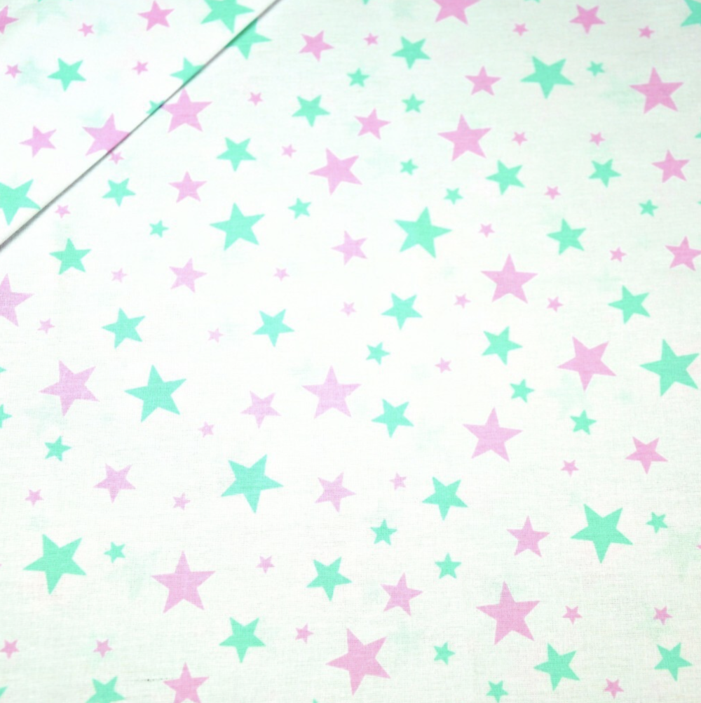 Tissu 100% coton blanc avec des étoiles rose et menthe dessus.