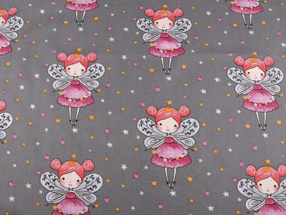 Tissu 100% coton gris avec des petites fées roses dessus. La fée fait 15cm de haut et 10.5cm de large