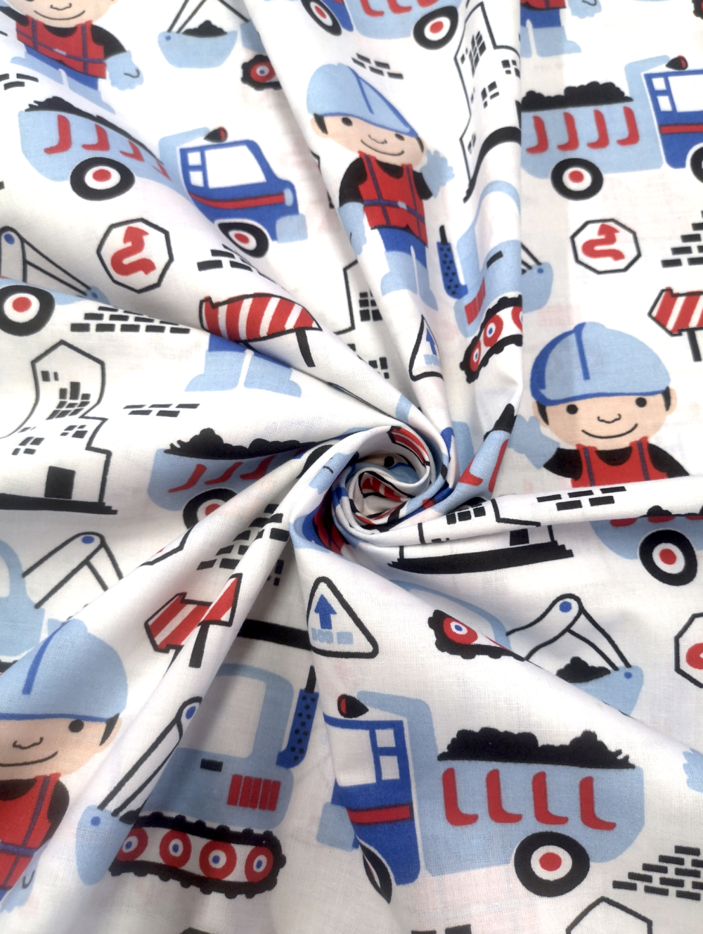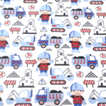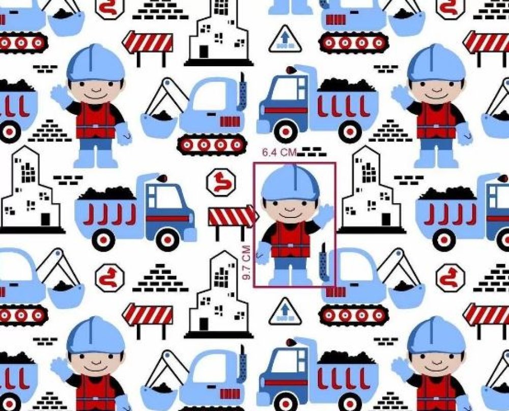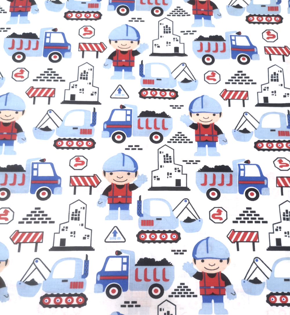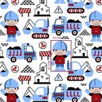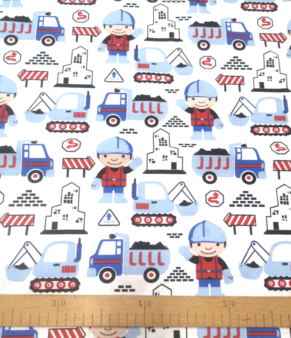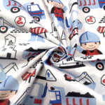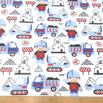 Tissu 100% coton bleu et rouge imprimé d'engins de chantier pour un petit garçon