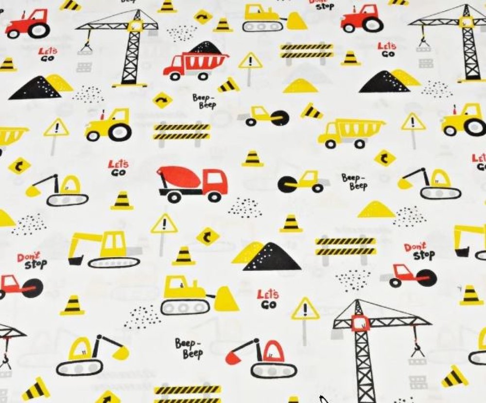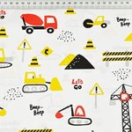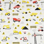 Tissu 100% coton blanc et jaune imprimé thème chantier pour un petit garçon