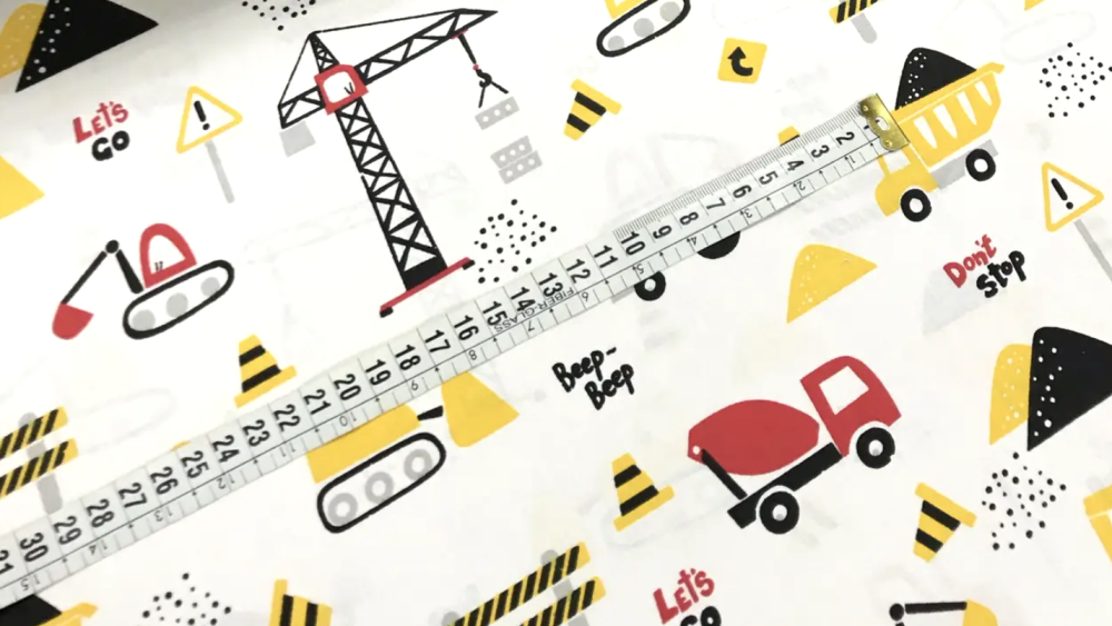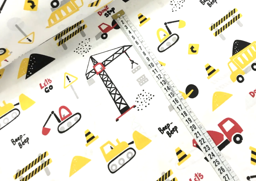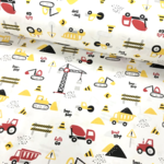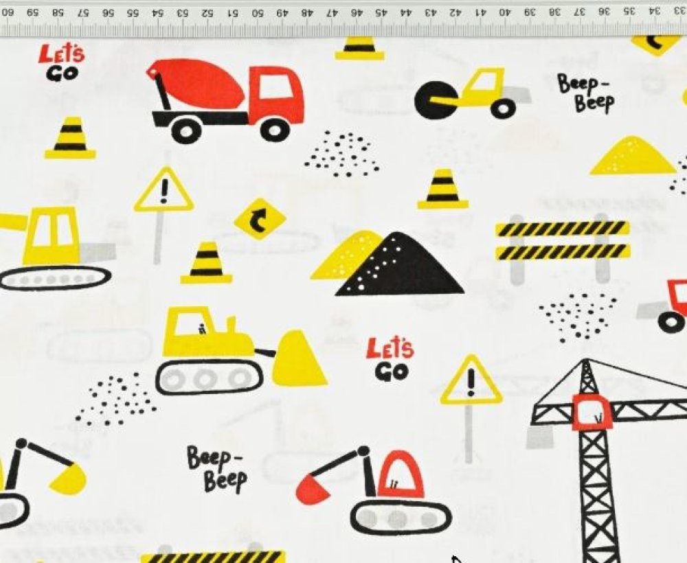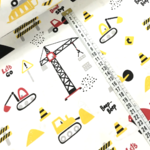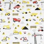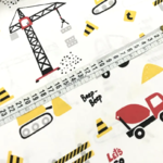 Tissu 100% coton blanc et jaune imprimé thème chantier pour un petit garçon