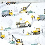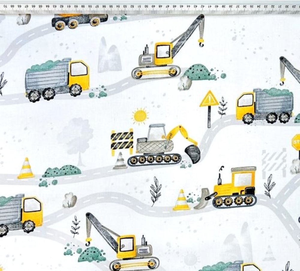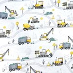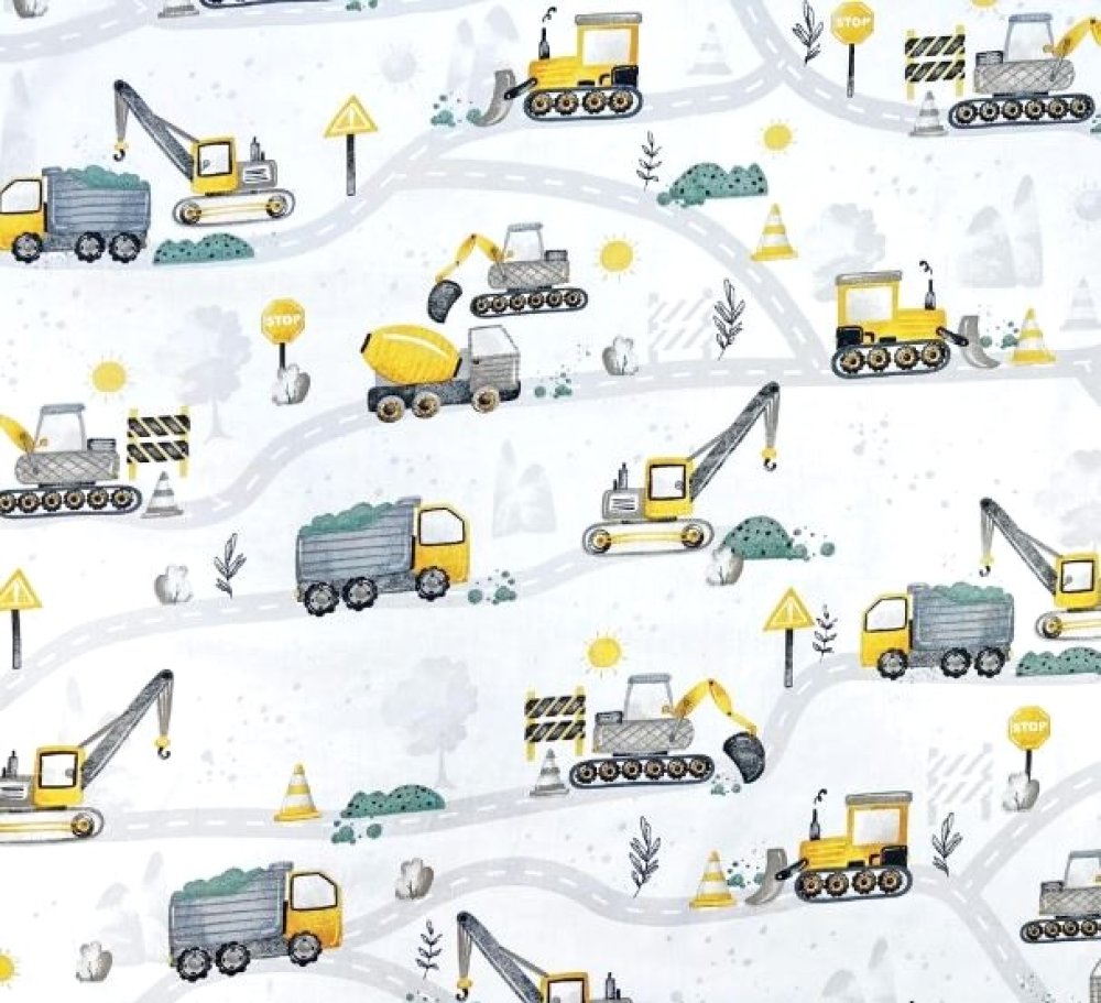 Tissu 100% coton blanc, jaune, vert et gris imprimé thème chantier
