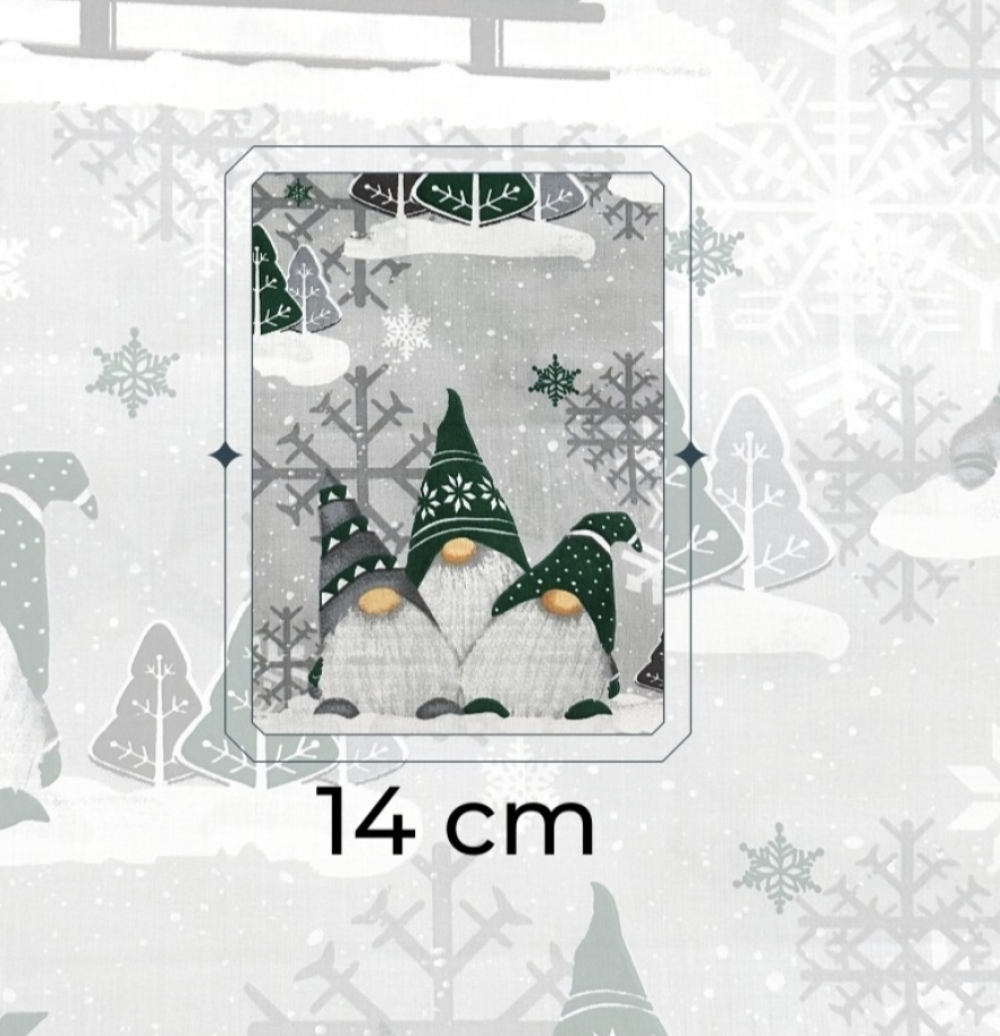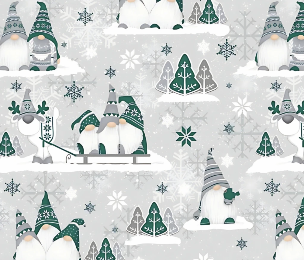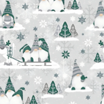 Tissu 100% coton gris avec des gnomes de Noël vert