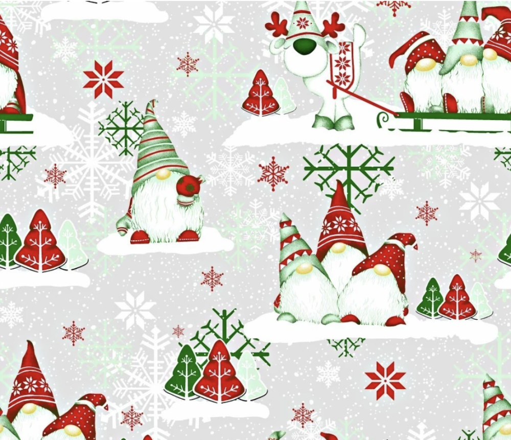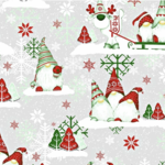 Tissu 100% coton gris avec des lutins de Noël vert et rouge