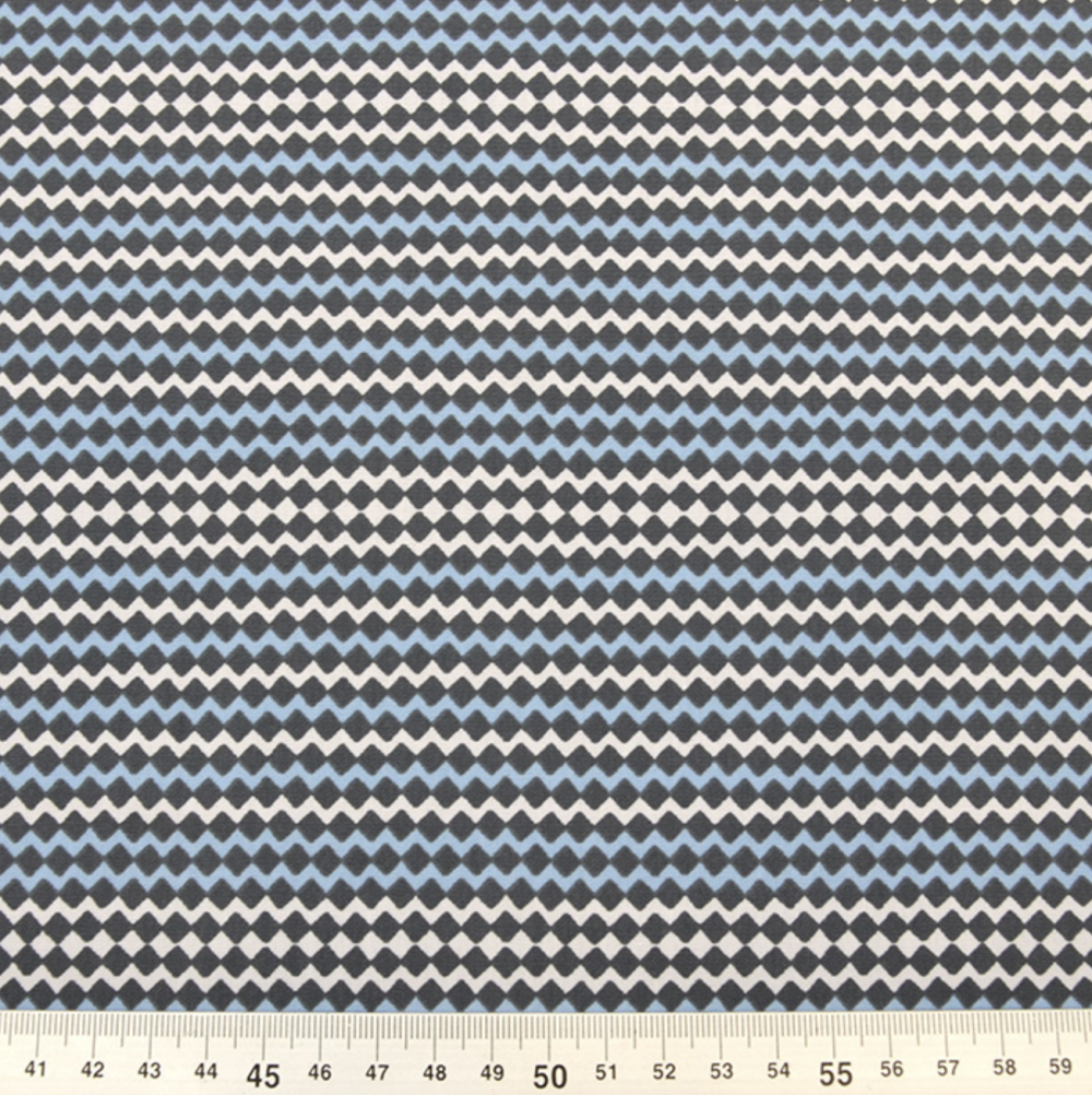 Tissu 100% coton bleu, gris et blanc avec des imprimés graphiques