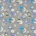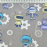 Tissu 100% coton bleu avec des robots multicolores dessus